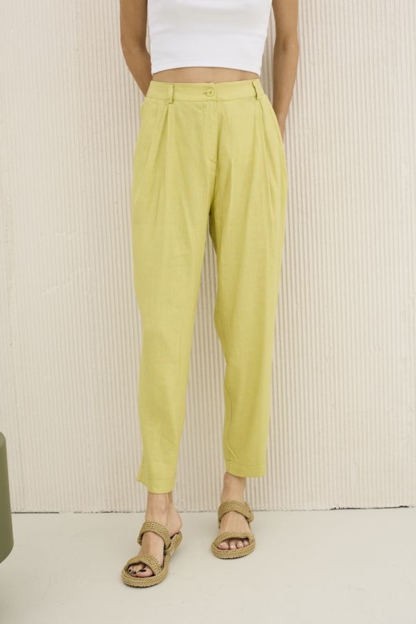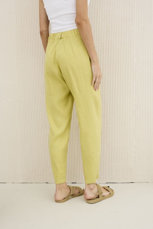 Состав: Лен 100%. Брюки свободного силуэта заужены к низу, верх брюк обработан притачным поясом с резинкой по спинке . В верхней части брюк расположены карманы и складки.