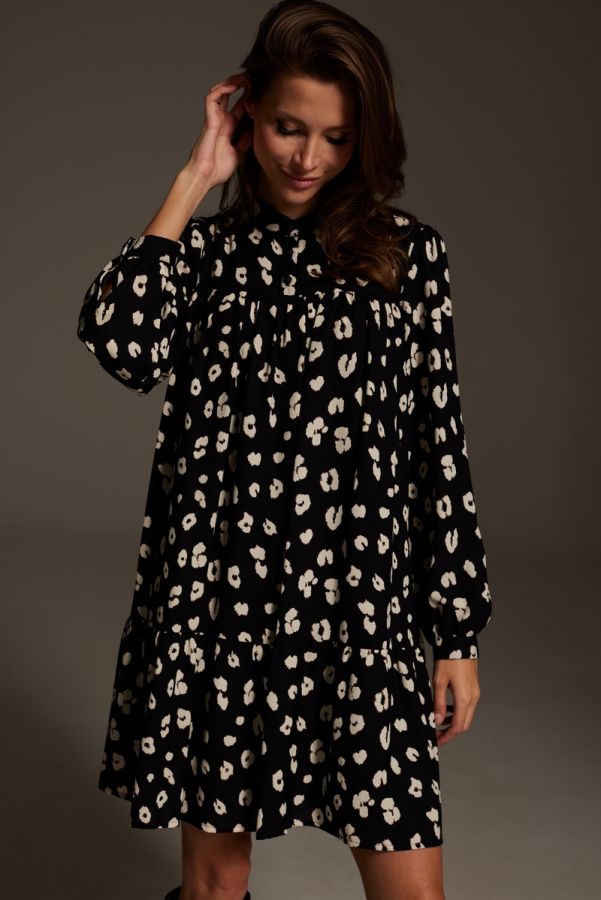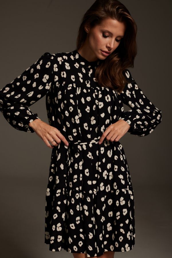 Платье женское свободного силуэта. Выполнено из искусственного шелка с принтом . Платье на трикотажной подкладке высокого качества. Рукав втачной одношовный со сборкой по окату и притачной манжетой . Над грудью расположен подрез . Горловина обработана аккуратной стойкой , застежка центральная на петли и пуговицы нижняя часть платья с притачной оборкой . В комплекте узкий пояс из основной ткани.