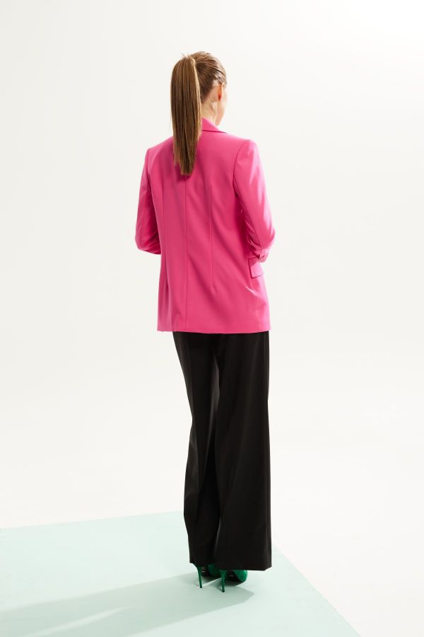 Комплект женский двухпредметный ,состоящий из жакета и брюк. Выполненный из костюмной ткани высокого качества . Жакет с центральной застежкой , рукав втачной двухшовный , внизу рукава шлица. Воротник стояче - отложной с отворотами лацканов . По переду жакета также функциональные карманы с клапанами . Жакет на подкладке. Брюки выполнены из эластичного однотона высокого качества .Брюки облегающего силуэта ,от колена аккуратное расклешение , что очень зрительно вытягивает и стройнит фигуру. Верх брюк обработан притачным поясом . В верхней части брюк расположены карманы .