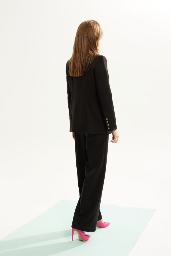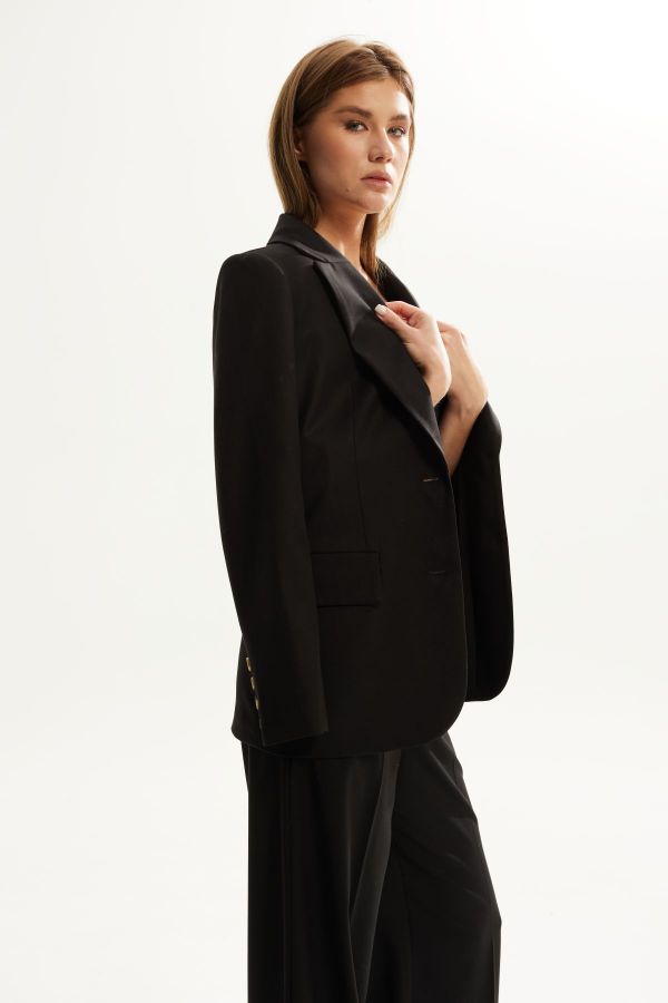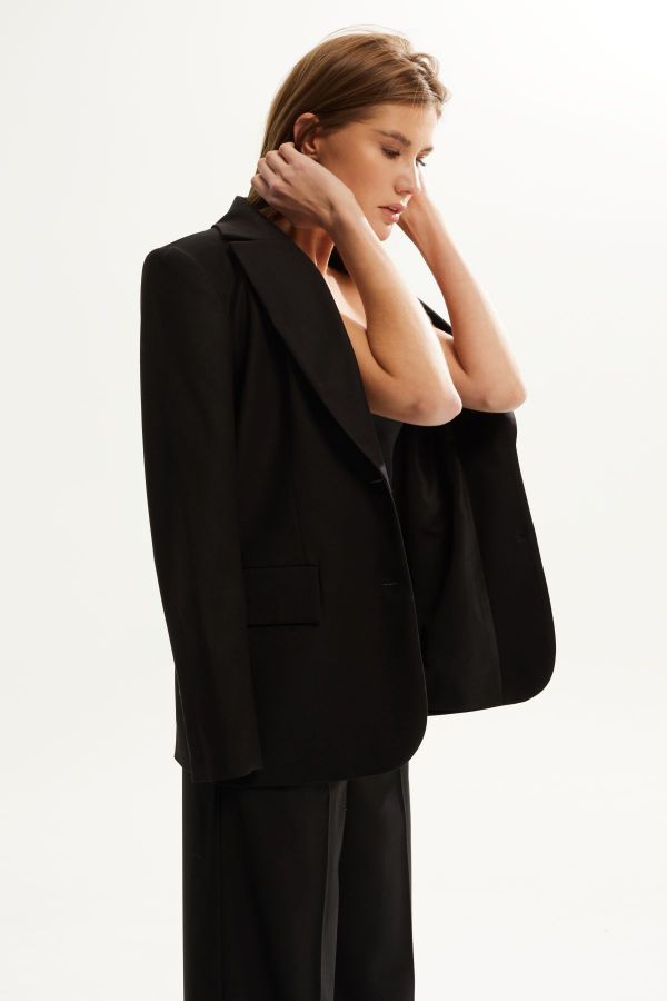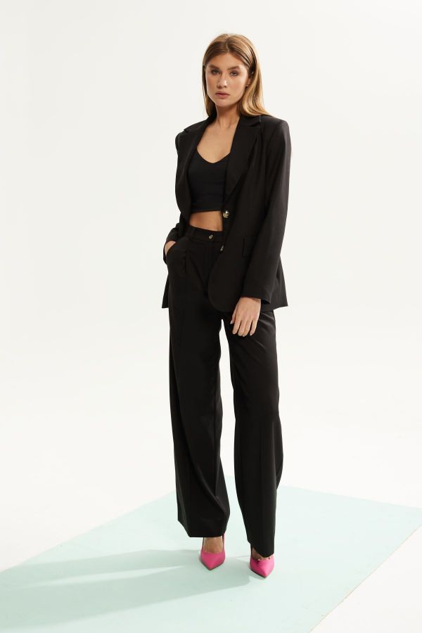 Костюм женский двухпредметный ,состоящий из жакета и брюк. Выполненный из костюмной ткани высокого качества . Жакет с центральной  застежкой , рукав втачной двухшовный , внизу рукава шлица. Воротник стояче - отложной с отворотами  лацканов . По переду жакета также функциональные карманы с клапанами . Жакет на  подкладке. Брюки выполнены из эластичного однотона высокого качества .Брюки облегающего силуэта ,от колена аккуратное расклешение , что очень зрительно вытягивает и стройнит фигуру. Верх брюк обработан притачным поясом . В верхней части брюк расположены карманы .