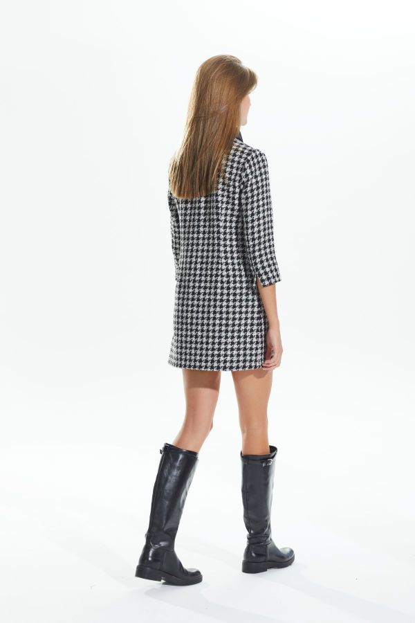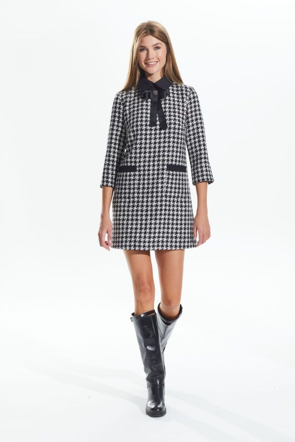 Платье женское полуприлегающего силуэта со съемным воротником и декором . Выполнено из ткани в стиле "Шанель " прекрасного качества . Рукав втачной одношовный с разрезом внизу . Спереди функциональные накладные карманы . Платье на шелковичной отлетной подкладке . Застежка - потайная молния по спинке .