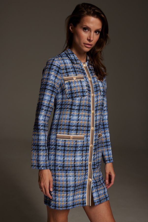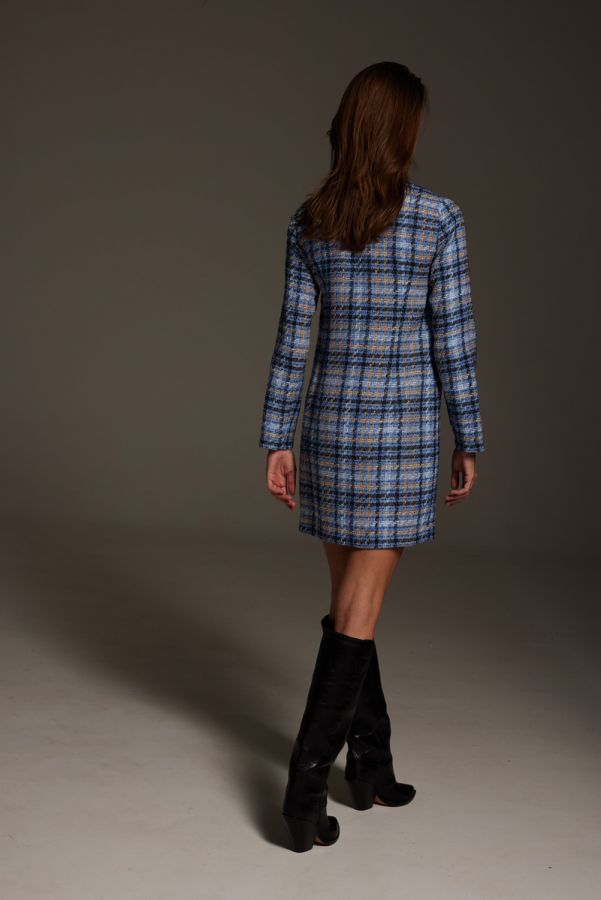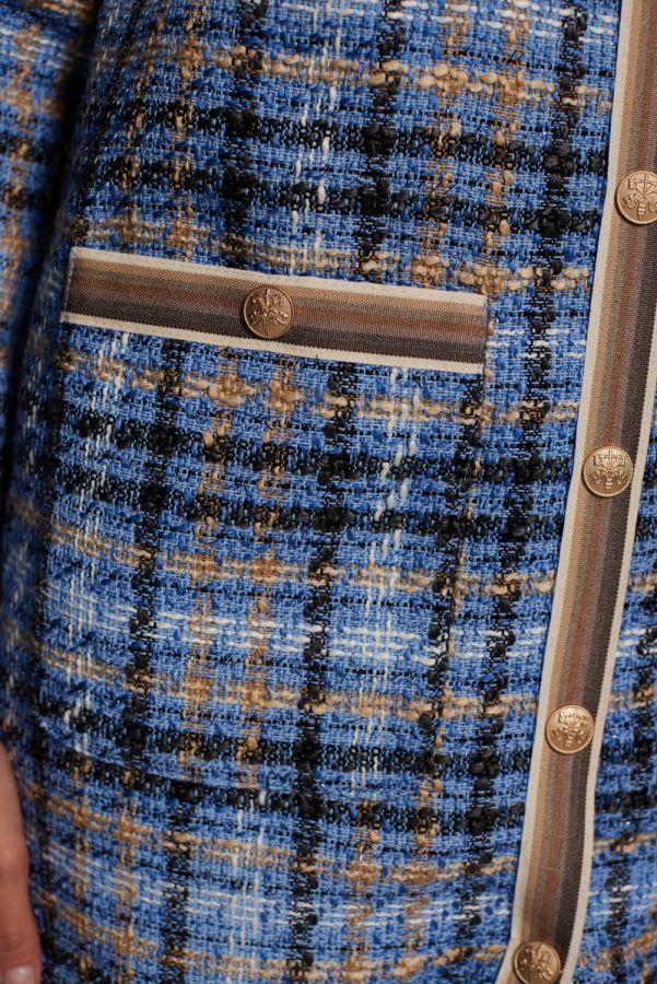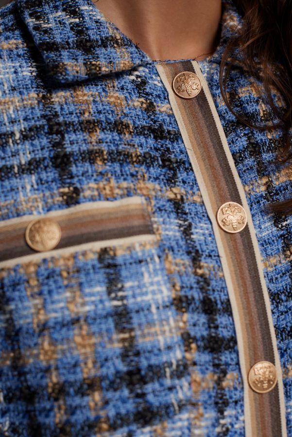 Платье женское полуприлегающего силуэта в стиле "Шанель", распашное с центральной застежкой на декоративные кнопки .Ткань из которой выполнеа данная модель очень приятная на ощупь , фактурная , очень хорошего качества. Платье на отлетной подкладке . Рукав втачной длинный (без подкладки). По переду накладные карманы с декоративными кнопками . Воротник рубашечного типа . По краю борта и верхнему краю карманов отделка в виде декоративной тесьмы .