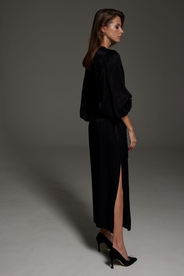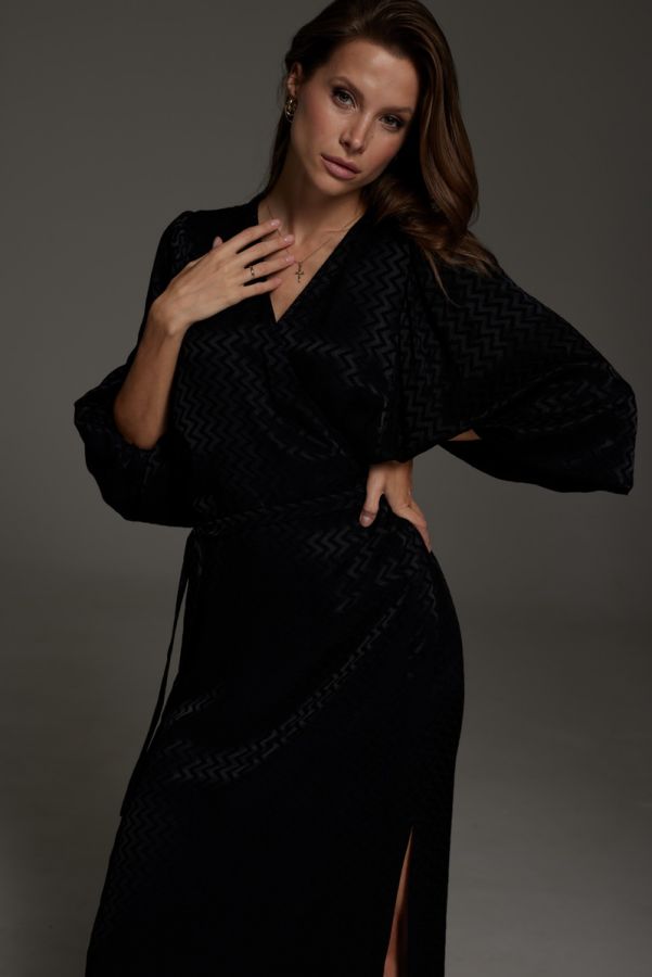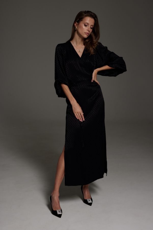 Платье женское приталенного силуэта. Выполнено из шикарного вискозного жаккарда .Распашное на запах , с объемными рукавами и разрезами по боковым швам