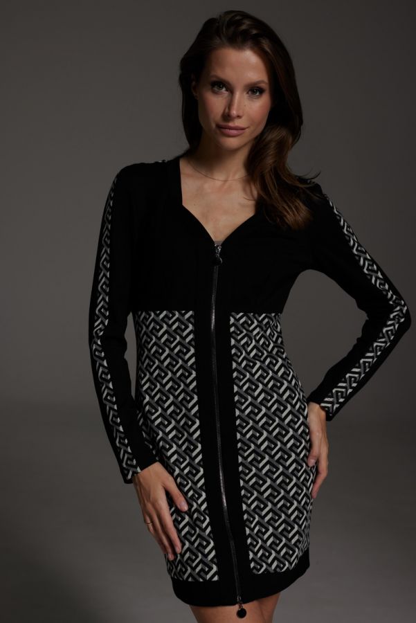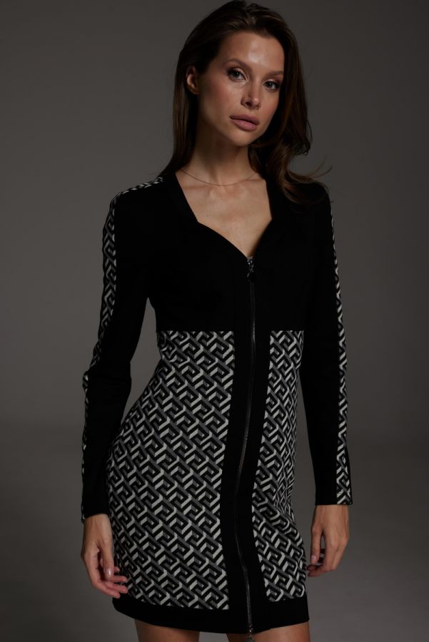 Платье женское приталенного силуэта. Выполнено из двух видов вискозного трикотажа : однотонного и принтованного . Рукав втачной одношовныйс отделочной лампасой . Отрезное под грудью , нижняя часть платья выполнена из отделочного трикотажа . Застежка центральная на декоративную металлическую разъемную молнию . Вырез горловины фигурный .