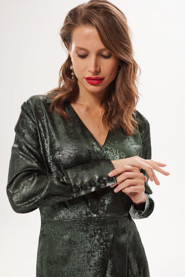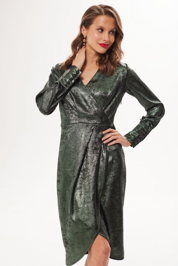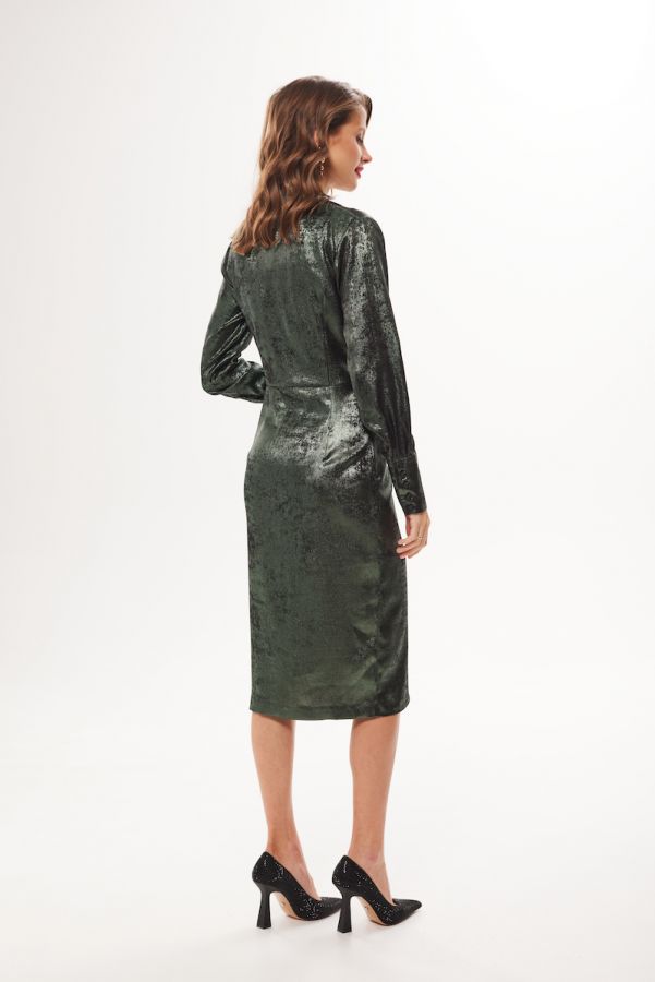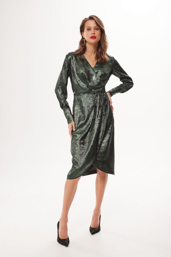 Платье женское, приталенного силуэта, выполнено из 100% вискозного жаккарда . Отрезное по линии талии , платье на запах в нижжней части . Воротник рубашечного типа. Рукав втачной одношовный , низ рукава обработан притачной манжетой . Данная модель платья - идеальное дополнение к гардеробу современной девушки .