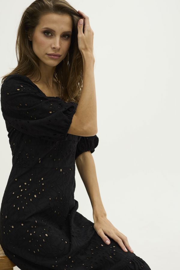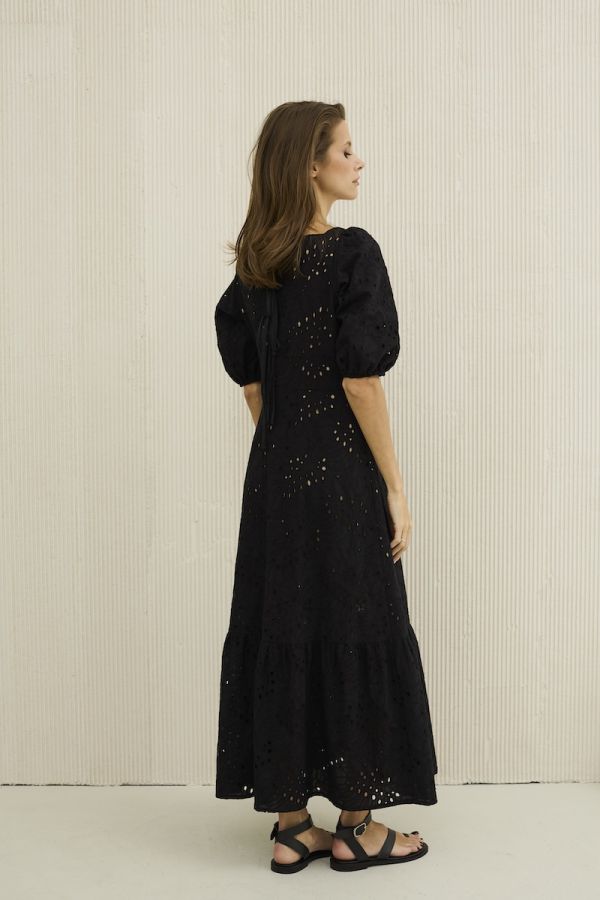 Платье женское приталенного силуэта выполнено из хлопкового ришелье . Платье на подкладке из 100 % хлопка . Вырез горловины "каре", рукав втачной одношовный , со сборкой по окату , низ рукава присборен на эластичную ленту. Внизу платье притачен волан , по спинке завязки из однотона . Застежка в виде потайной молнии в боковом шве .