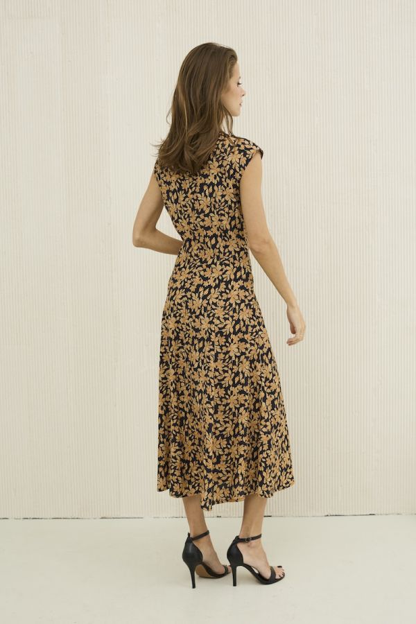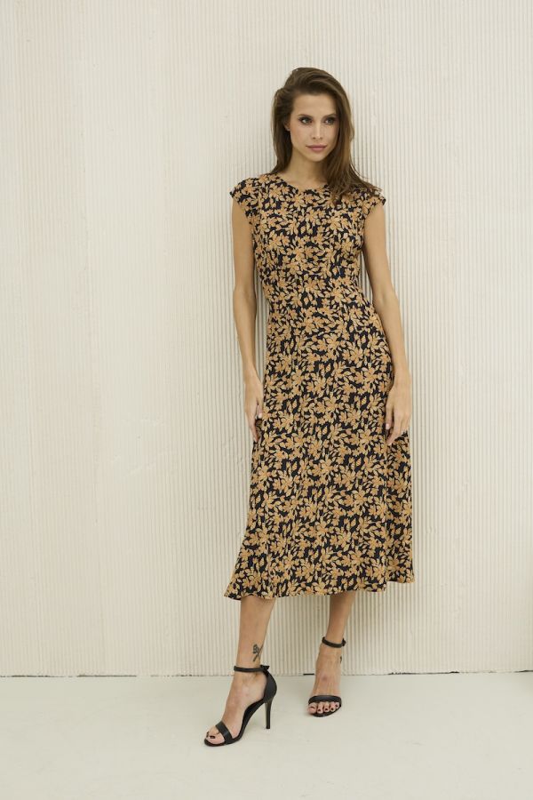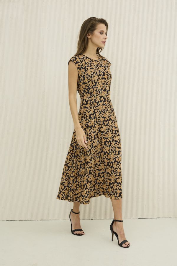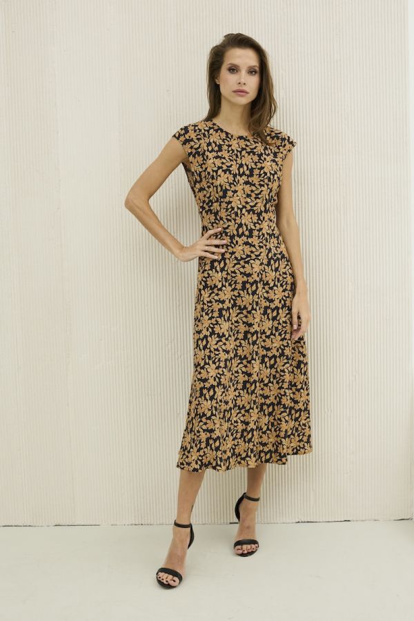 Платье женское, приталенного силуэта, выполнено из принтованного вискозного шелка высокого качества . В области талии фигурные подрезы . Рукав слегка спущенный . Горловина круглой формы . Нижняя часть платья - крой полусолнце . Застежка в виде потайной молнии в боковом шве .
