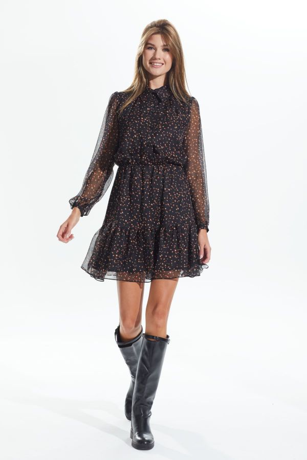 Платье женское полуприлегающего силуэта. Выполнено из шикарного шифона с принтом . Платье на трикотажной подкладке высокого качества. Рукав втачной одношовный со сборкой по окату и притачной манжетой . Отрезное по линии талии , нижняя часть платья с притачной оборкой . Застежка центральная на петли и пуговицы, воротник рубашечного типа .
