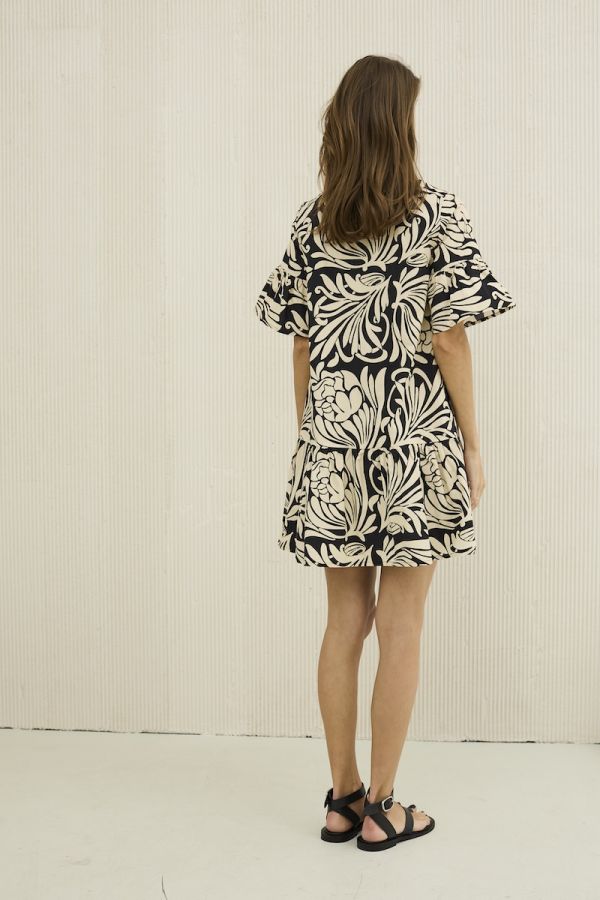 Платье женское , А-образного силуэта . Выполнено из 100 % хлопка с принтом . Платье распашное с центральной застежкой в виде планки на петли и пуговицы . Горловина оформлена рубашечным воротником . Рукав втачной одношовный с оборкой . По линии бедер порез , куд притачена оборка