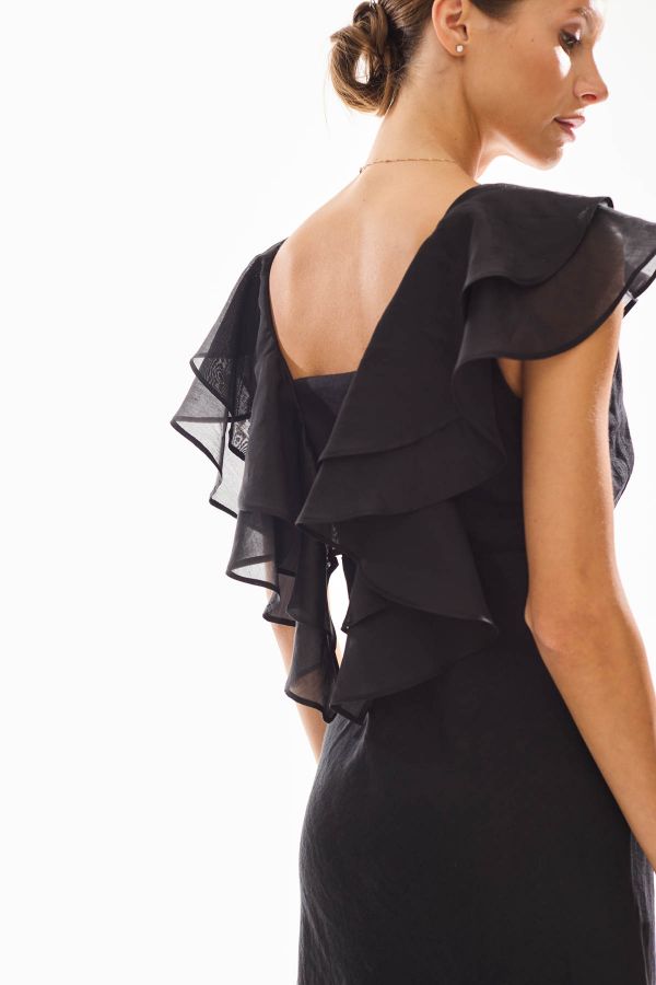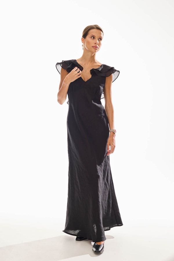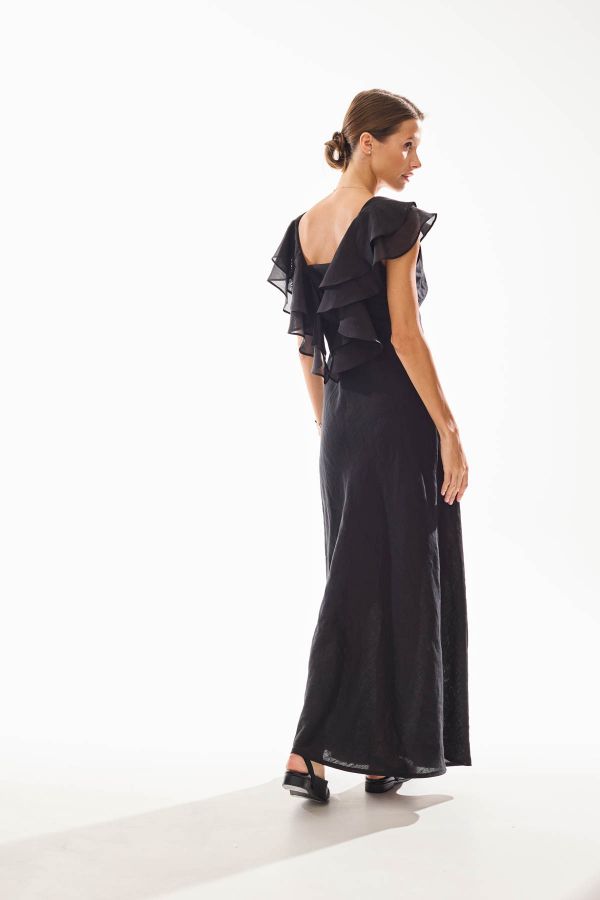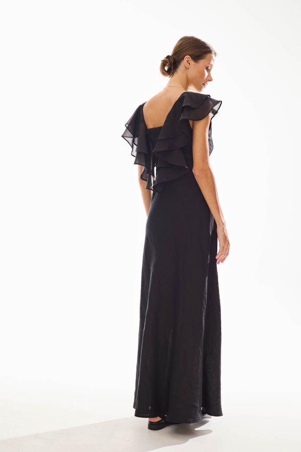 Платье женское полуприлегающего силуэта, отрезное под грудью. Нижняя часть платья раскроена по косой, что очень стройнит фигуру. Акцентом данного платья являются воланы из вуали, которые переходят на спику и декорируют ее.