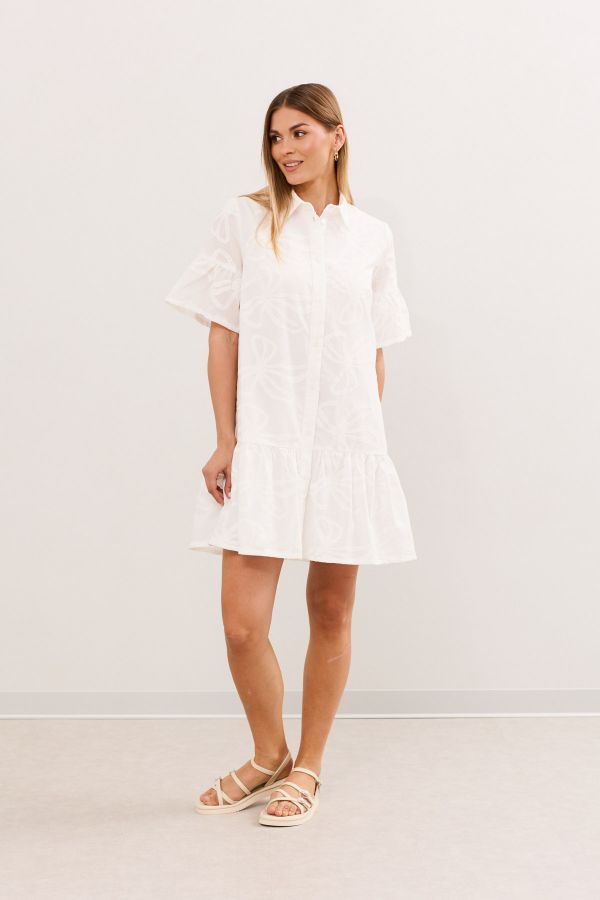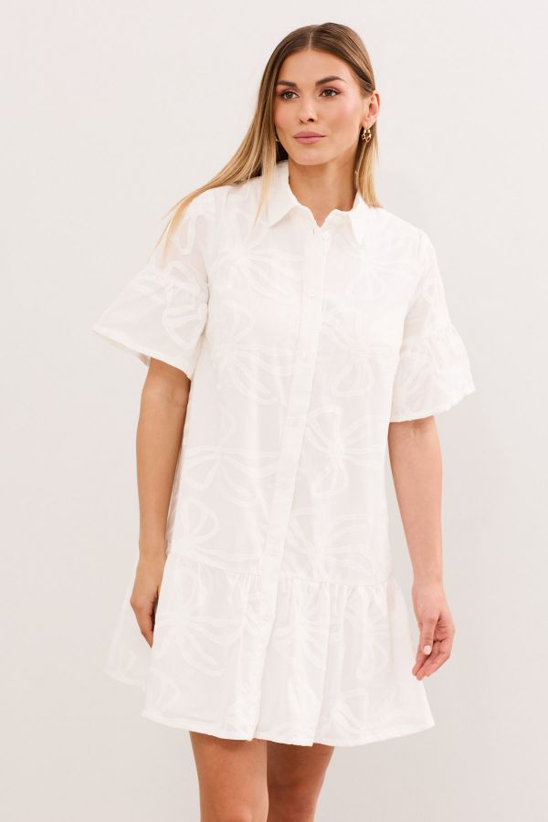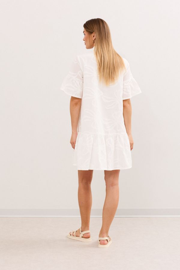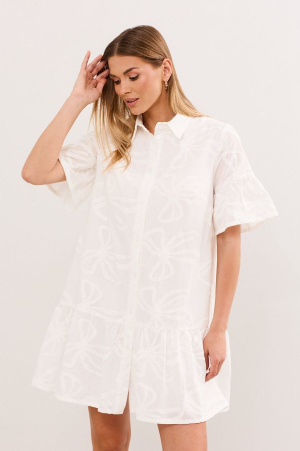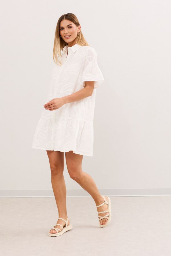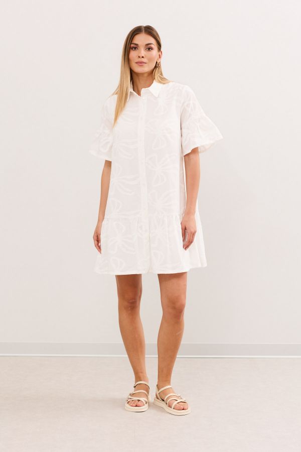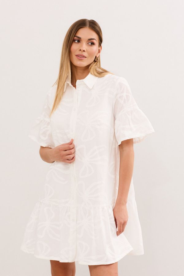 Платье женское, А-образного силуэта на подкладке. Выполнено из хлопкового ришелье. Платье распашное с центральной застежкой в виде планки на петли и пуговицы. Горловина оформлена рубашечным воротником . Рукав втачной одношовный с оборкой. По линии бедер подрез, куда притачена оборка .