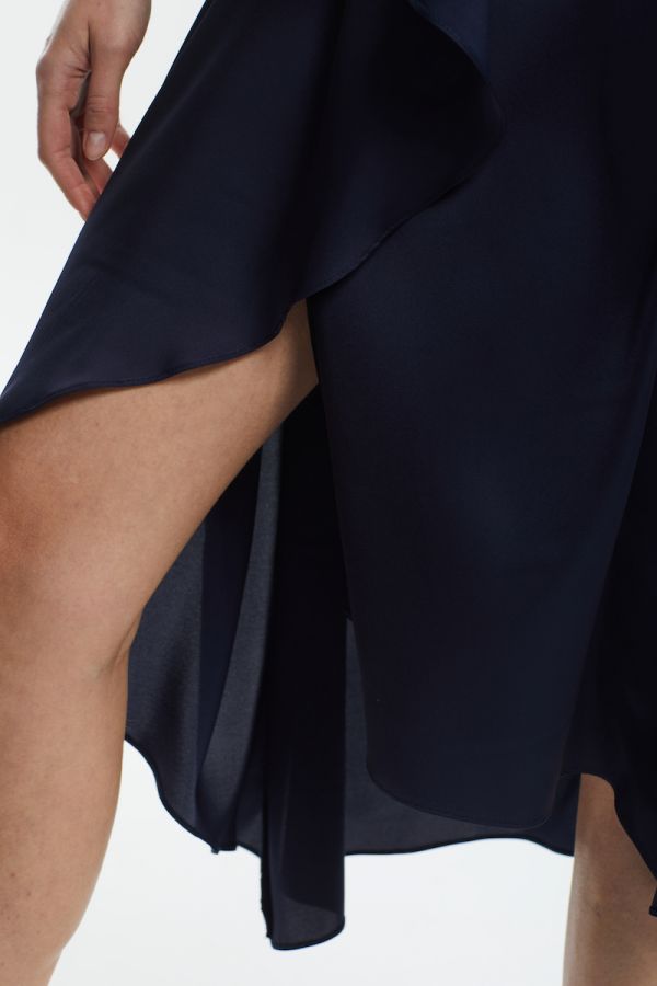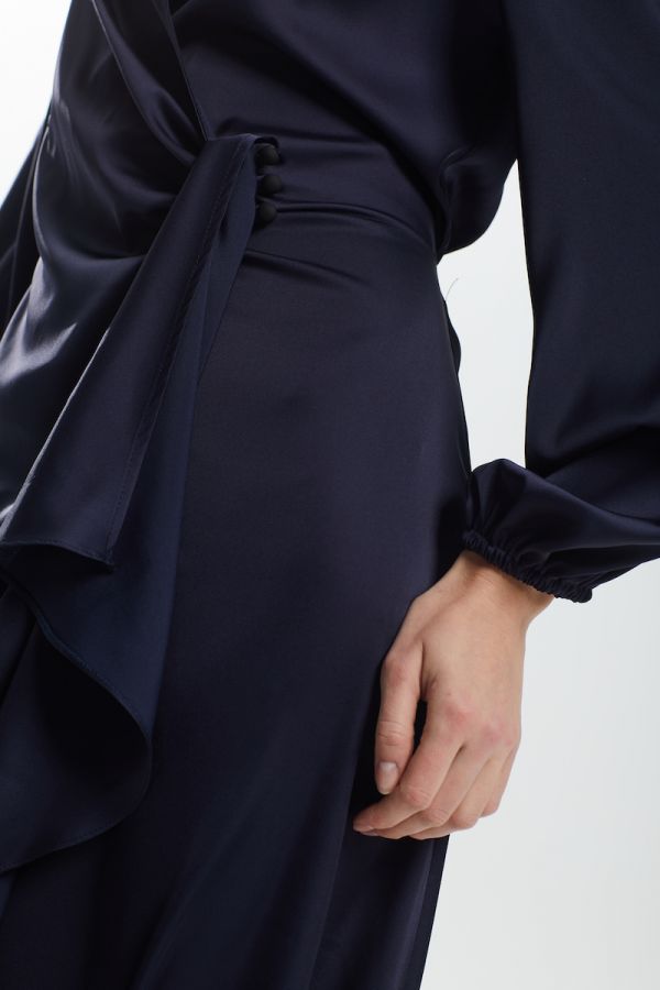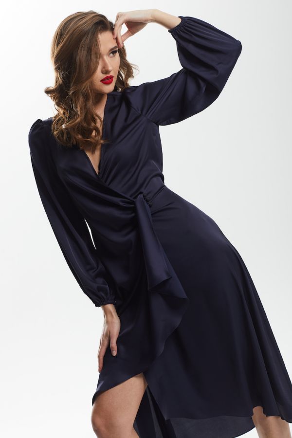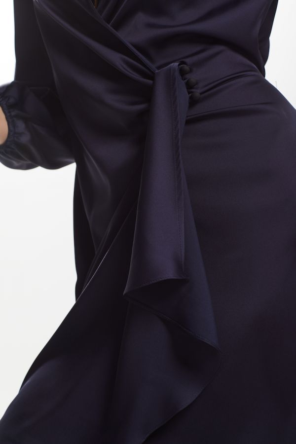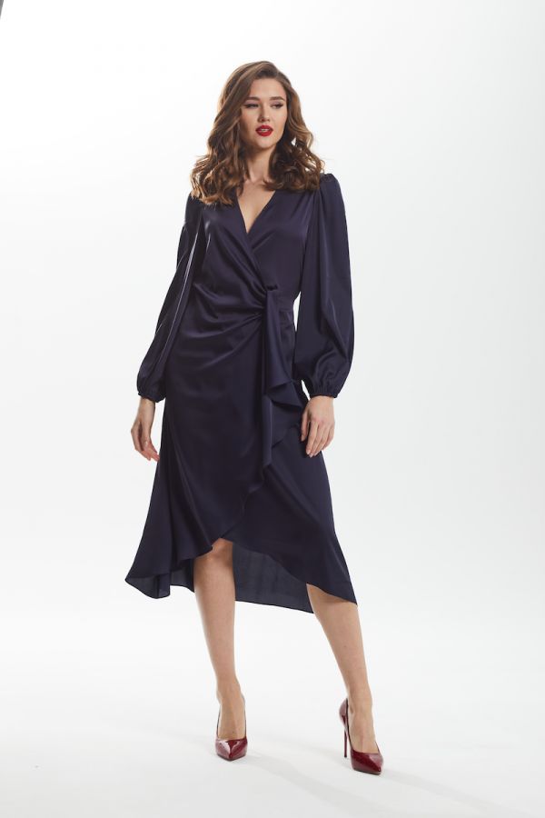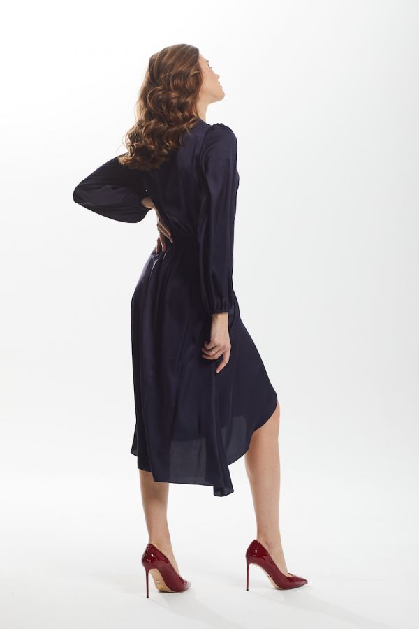Платье женское, приталенного силуэта, выполнено из искусственного шёлка премиум качества, в области талии драпировка, застёжка на навесные петли и декоративные пуговицы, ассиметричный низ, втачной рукав, низ рукава на резинке, окат рукава со сборкой.