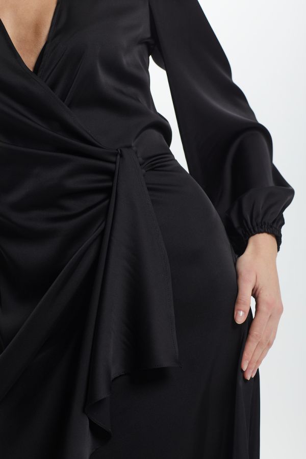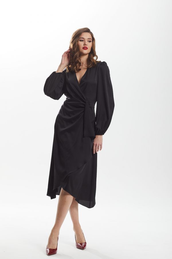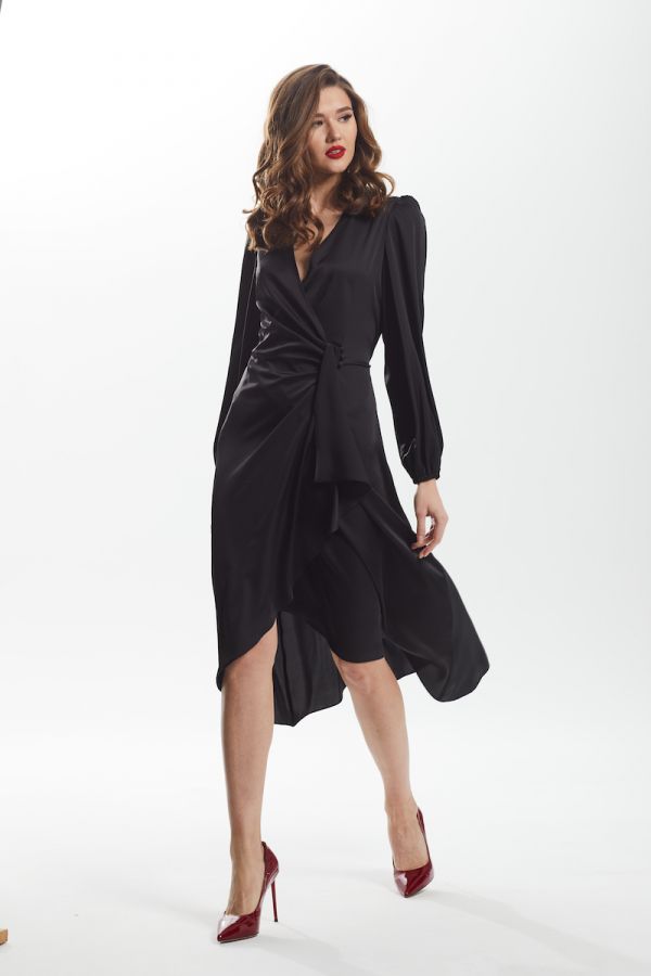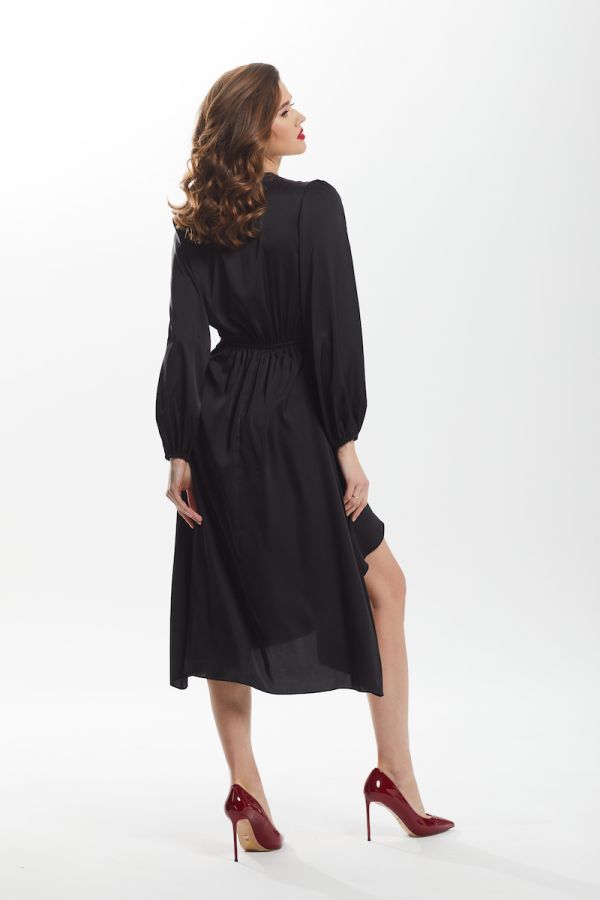Платье женское, приталенного силуэта, выполнено из искусственного шёлка премиум качества, в области талии драпировка, застёжка на навесные петли и декоративные пуговицы, ассиметричный низ, втачной рукав, низ рукава на резинке, окат рукава со сборкой.