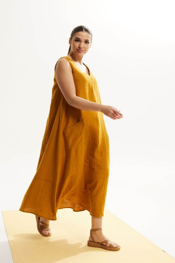 Платье женское, свободного силуэта. Выполнено изо льна премиум качества. По переду платья накладные карманы, расположены от бокового шва. Горловина оформлена V-образным вырезом. Платье за счет грамотного кроя не увеличивет объем, красиво драпируется, очень стильно смотрится.
