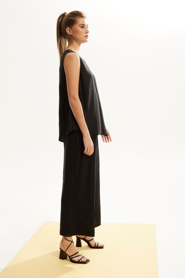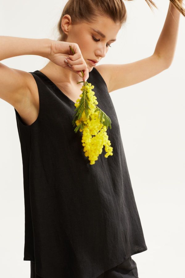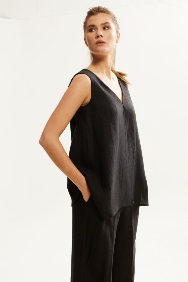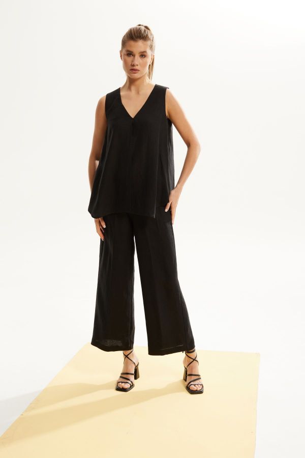 Костюм женский двухпредметный, состоящий из жакета и блузы с запахом и фигурным низом. Горловина блузы V -образной формы. Выполненный из льнянной ткани премиум качества. Брюки свободного силуэта длиной 7/8. Верх брюк обработан притачным поясом с резинкой по спинке. В верхней части брюк расположены карманы.