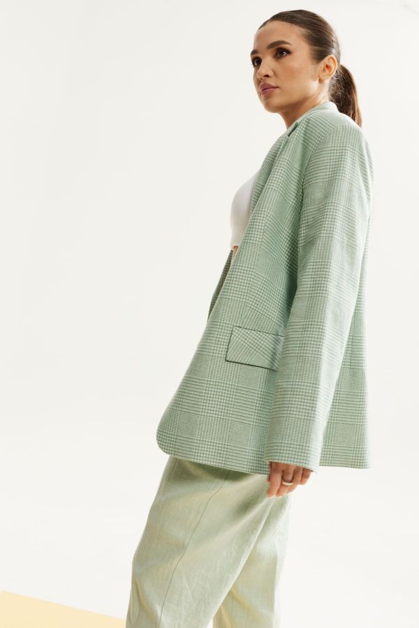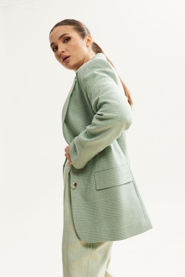 Комплект женский двухпредметный, свободного силуэта. Жакет выполнен из костюмной льянной ткани высокого качества. Жакет с центральной застежкой, рукав втачной двухшовный, внизу рукава шлица. Воротник стояче - отложной с отворотами лацканов . По переду жакета также функциональные карманы с клапанами. Жакет на подкладкеиз хлопка. Брюки свободного силуэта заужены к низу, верх брюк обработан притачным поясом с резинкой по спинке. В верхней части брюк расположены карманы и складки.
