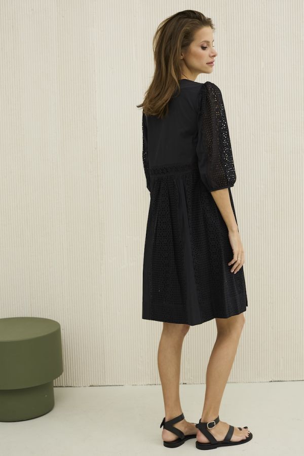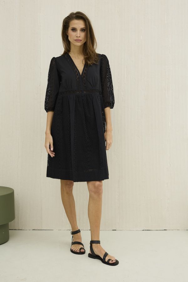Платье женское, свободного силуэта. Выполнено из хлопкового ришелье и однотона. Вырез горловины Y-образный формы, рукав втачной со сборкой длиной 3/4. Платье отрезное выше линии талии, нижняя часть платья на хлопковой подкладке.