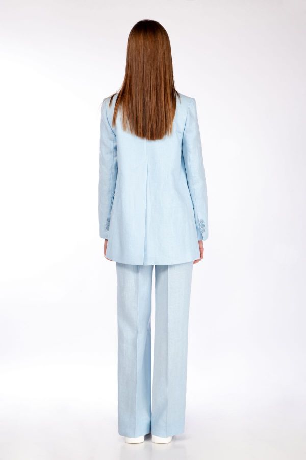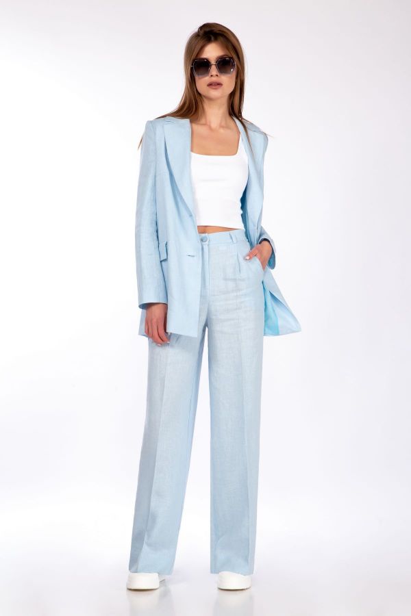 Костюм женский двухпредметный , прямого силуэта . Выполненный из умягченного льна высокого качества . Жакет однобортный , рукав втачной двухшовный со шлицей . Воротник стояче - отложной с отворотами лацканов . По переду жакета также функциональные карманы с клапанами . Жакет на хлопковой подкладке , по спинке жакета высокая шлица . Брюки прямого силуэта , верх брюк обработан притачным поясом . В верхней части брюк расположены карманы .