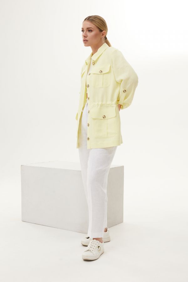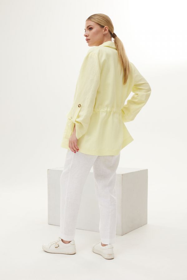 Костюм женский двухпредметный, свободного силуэта. Выполнен из 100 % льна. Жакет с центральной застежкой в виде планки на петли пуговицы, рукав втачной одношовный, жакет без подкладки. По переду жакета функциональные карманы с клапанами. Чуть ниже талии расположена внутренняя кулиса с отделочным шнуром и фискаторами. Брюки свободного силуэта, заужены к низу. Верх брюк обработан притачным поясом. В верхней части брюк расположены карманы.
