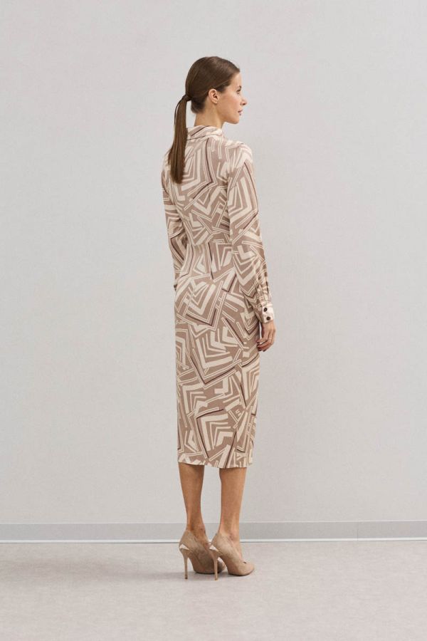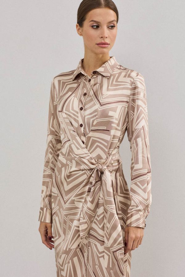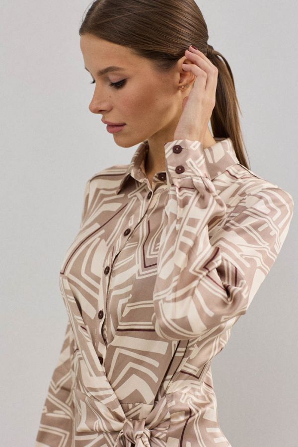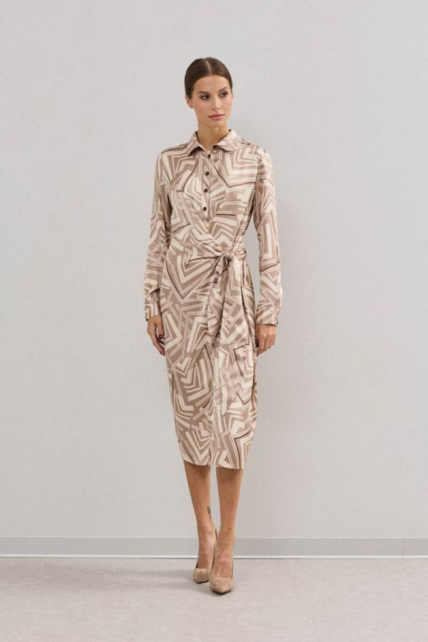 Платье женское, приталенного силуэта, выполнено из 100%-вискозного крепа средней плотности. Отрезное по линии талии , платье на запах в нижней части, с завязывающимся поясом. Воротник рубашечного типа, застежка центральная на петли и пуговицы. Рукав втачной одношовный, низ рукава обработан притачной манжетой. Данная модель платья - идеальное дополнение к гардеробу современной девушки.