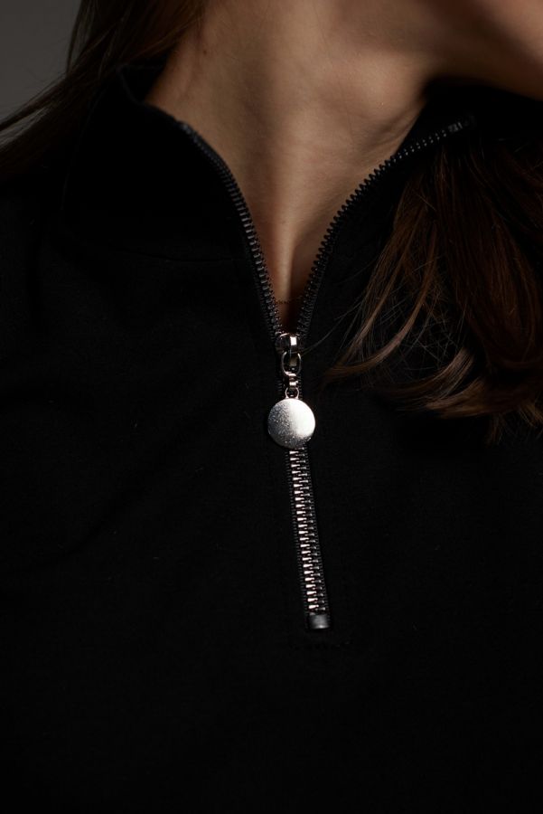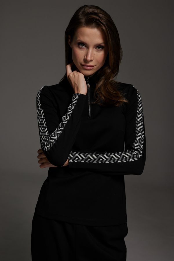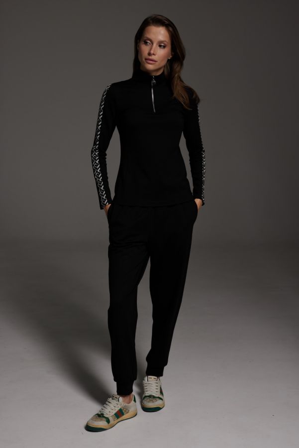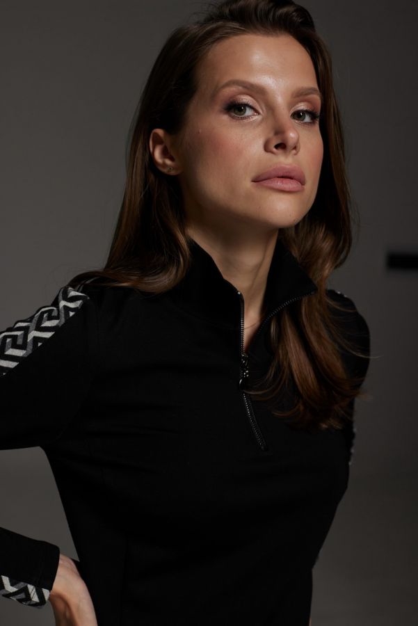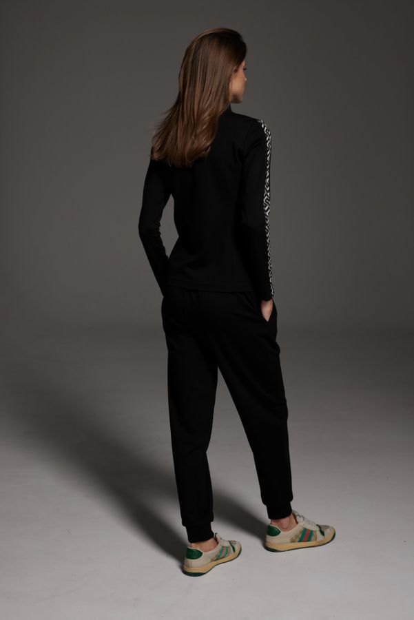 Комплект женский двухпредметный , состоящий из лонгслива и брюк . Комплект выполнен из двух видов трикотажа . Горловина в виде стойки , рукав реглан . Брюки слегка заужены к низу , низ брюк обработан манжетой , в боковых швах расположены функциональные карманы ,пояс брюк с резинкой .