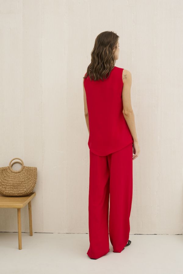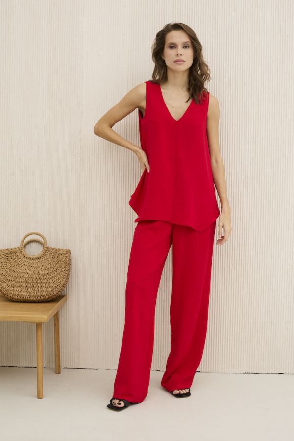 Комплект женский двухпредметный , состоящий из брюк и блузы с запахом и фигурным низом. Горловина блузы V -образной формы. Выполнен из американского крепа высокого качества .Брюки свободного силуэта ,верх брюк обработан притачным поясом с резинкой и кулисой . В верхней части брюк расположены боковые карманы .
