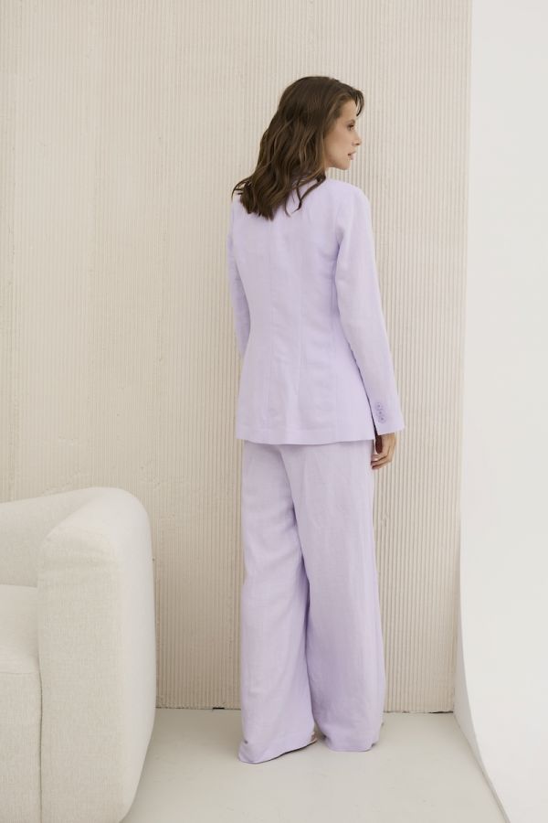 Костюм женский двухпредметный ,приталенного силуэта Выполненный изо льна. Жакет с центральной застежкой , рукав втачной двухшовный , внизу рукава шлица. Воротник стояче - отложной с отворотами лацканов . По переду жакета также функциональные карманы с клапанами . Перед жакет на подкладкеиз хлопка. Брюки прямого свободного силуэта, верх брюк обработан притачным пясом с резинкой и кулисой. . В верхней части брюк расположены карманы .