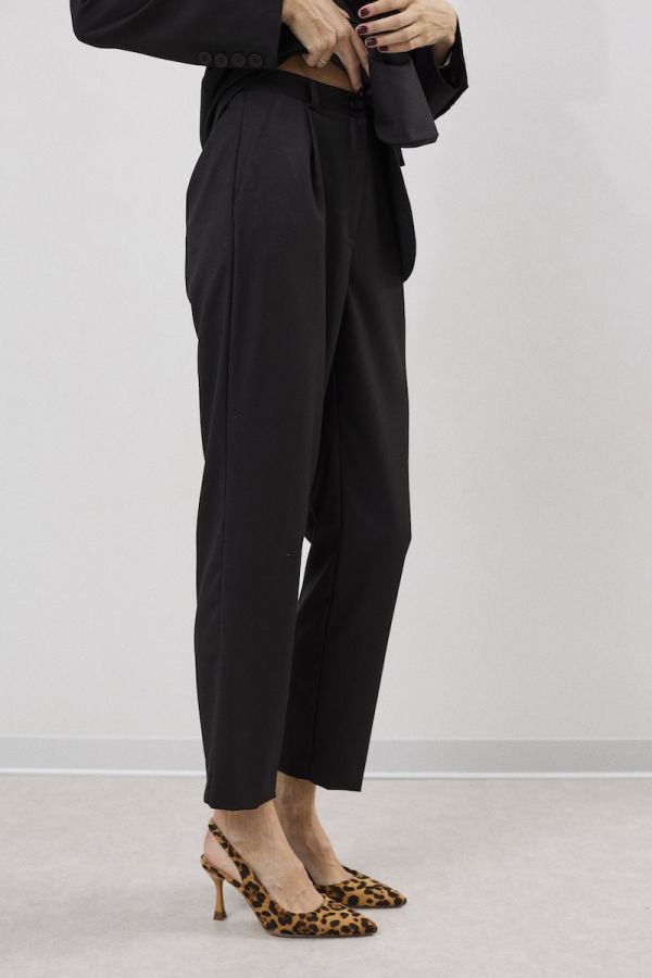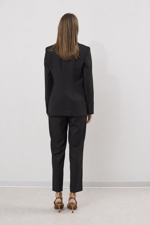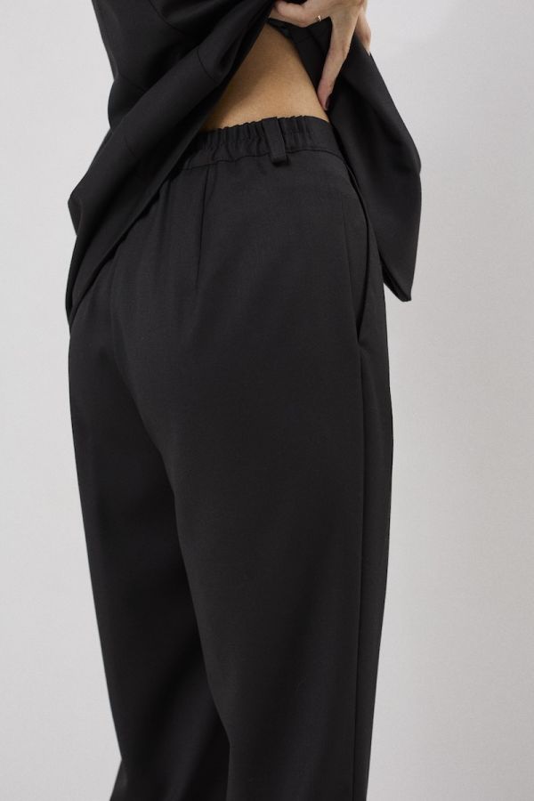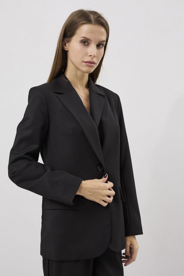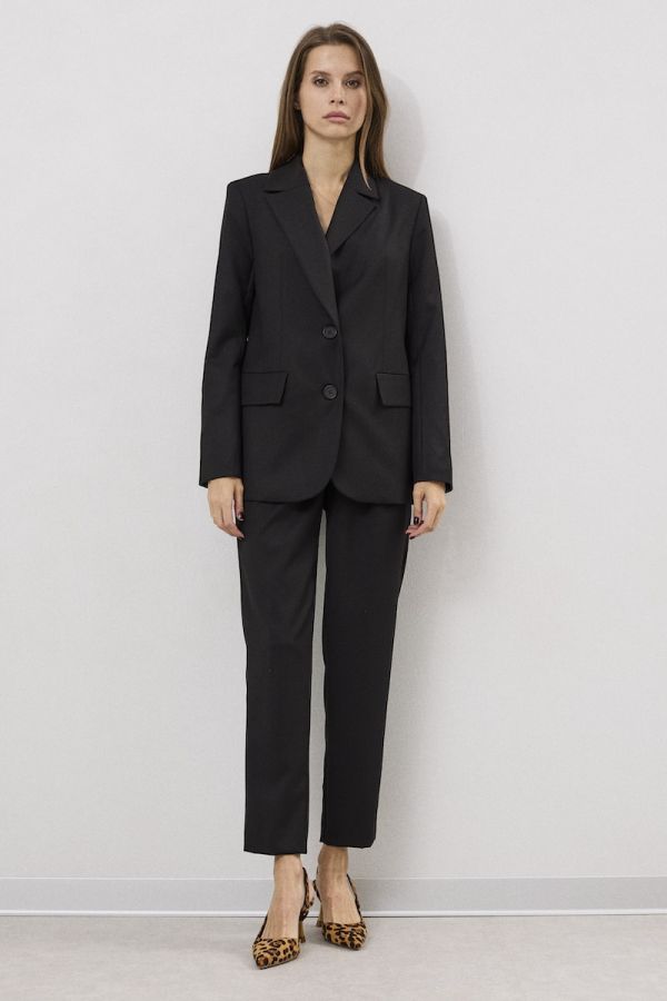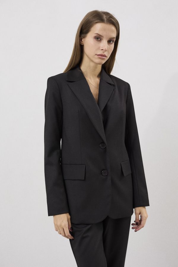 Костюм женский двухпредметный, полуприлегающего силуэта, выполненный из костюмного однотона высокого качества. Жакет с однобортной застежкой, рукав втачной двухшовный с декоративной шлицей снизу. Воротник стояче - отложной с отворотами лацканов. По переду жакета также функциональные карманы с клапанами. Жакет на подкладке. Брюки слегка заужены к низу, верх брюк обработан притачным поясом, по спинке пояса - резинка. В верхней части брюк расположены карманы .