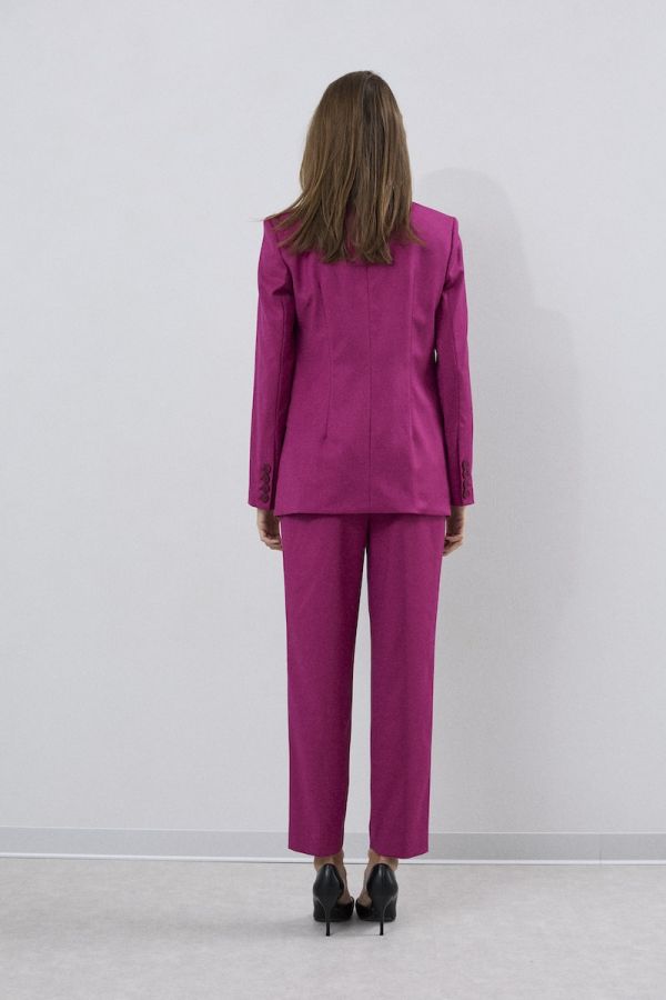 Костюм женский двухпредметный, полуприлегающего силуэта, выполненный из костюмного однотона высокого качества. Жакет с однобортной застежкой, рукав втачной двухшовный с декоративной шлицей снизу. Воротник стояче - отложной с отворотами лацканов. По переду жакета также функциональные карманы с клапанами. Жакет на подкладке. Брюки слегка заужены к низу, верх брюк обработан притачным поясом, по спинке пояса - резинка. В верхней части брюк расположены карманы.