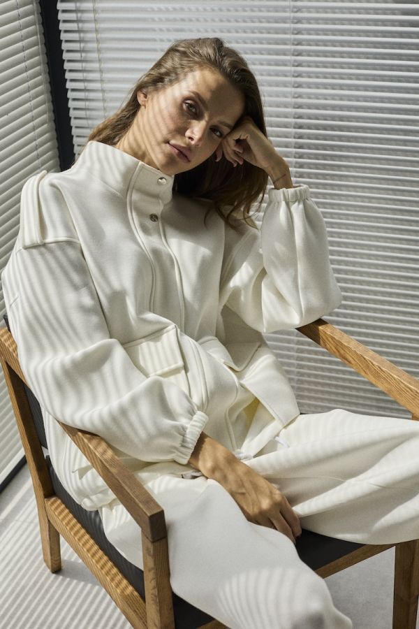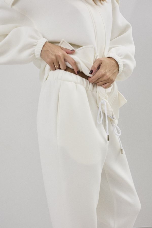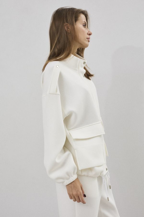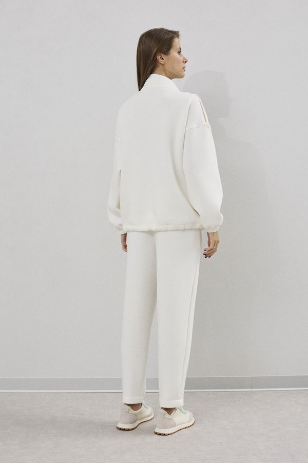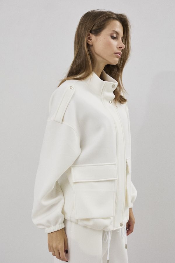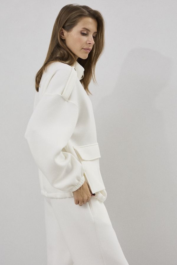 Комплект женский двухпредметный свободного силуэта. Выполненный из пластичного трикотажного полотна . Жакет с центральной застежкой в виде планки с молнией и кнопками, рукав втачной одношовный с резинкой по низу . По переду жакета функциональные карманы с клапанами. Снизу жакета расположена кулиса с отделочным шнуром. Брюки свободного силуэта , заужены у низу . Верх брюк обработан притачным поясом с резинкой . В верхней части брюк расположены карманы.