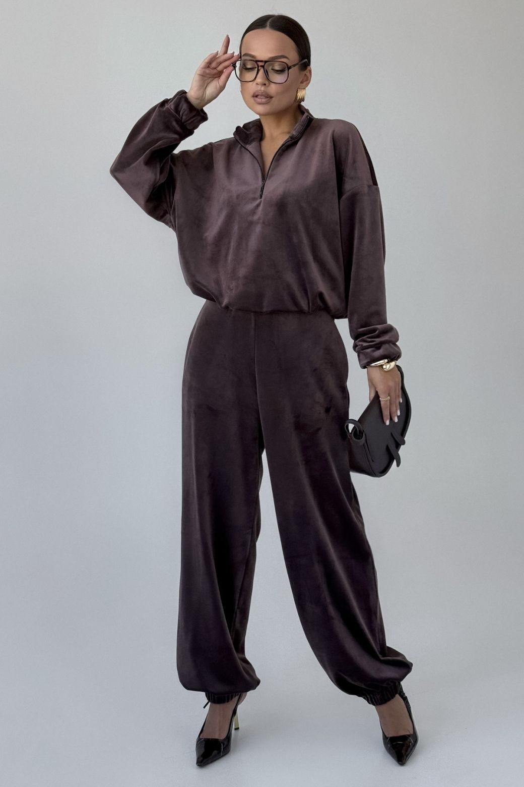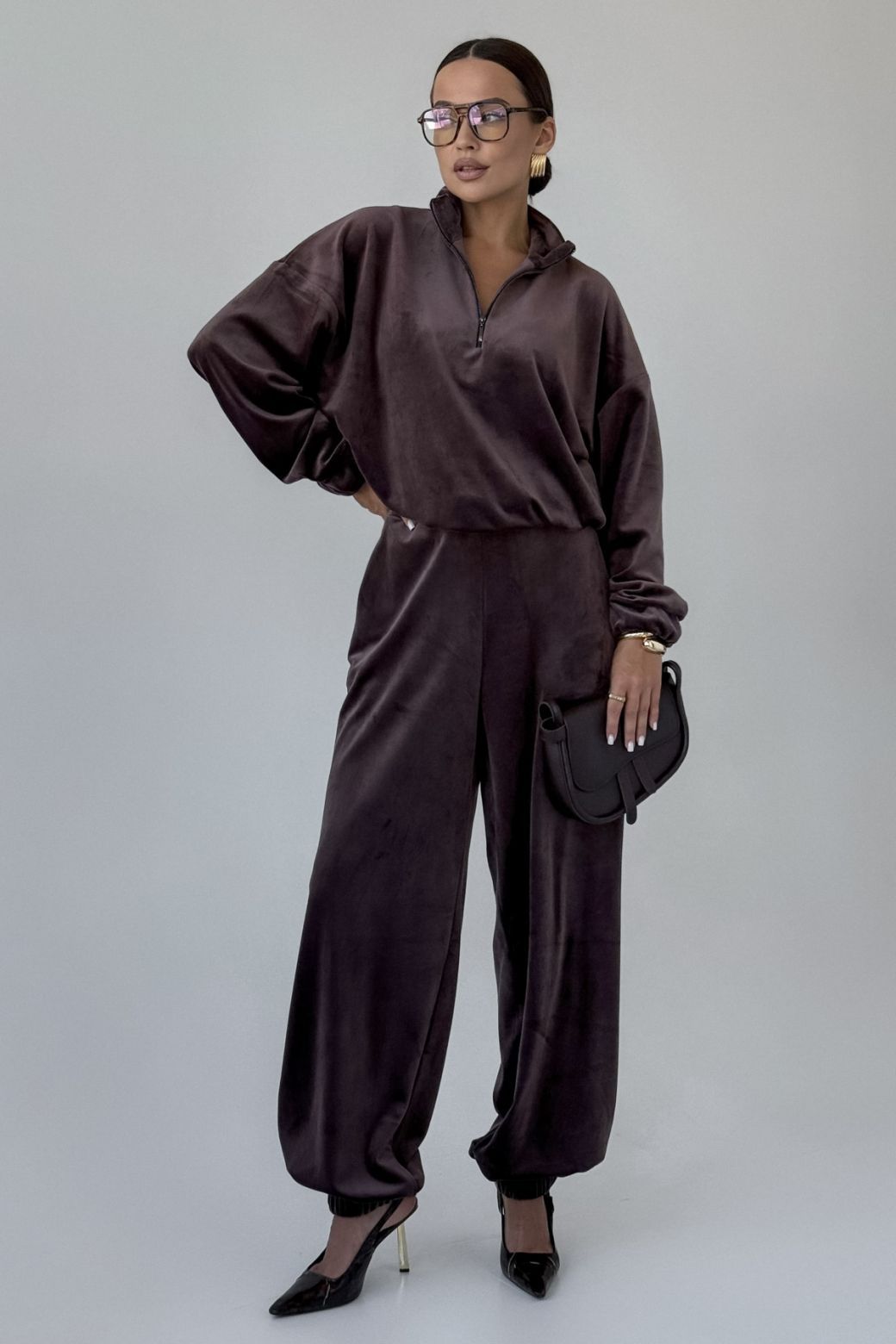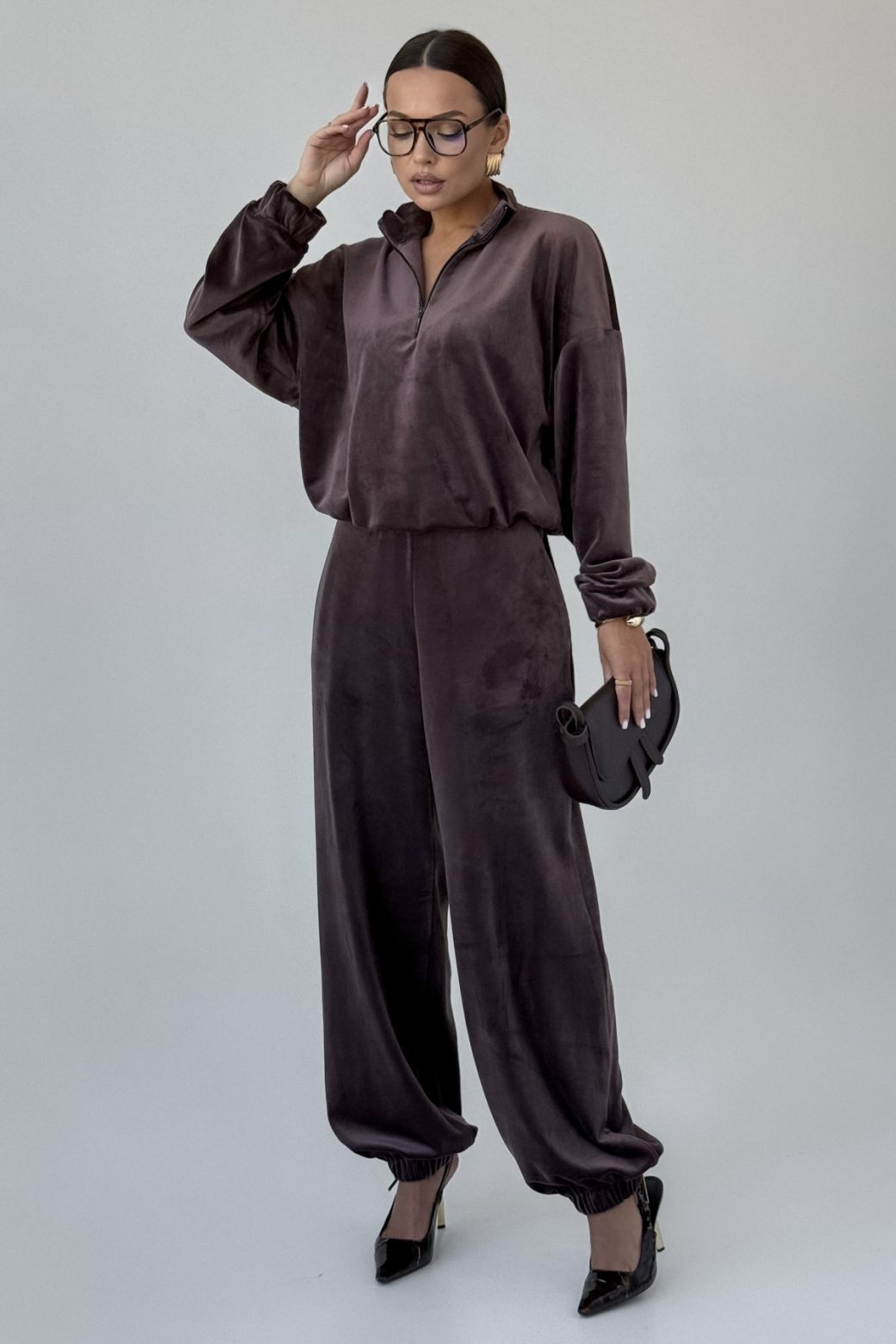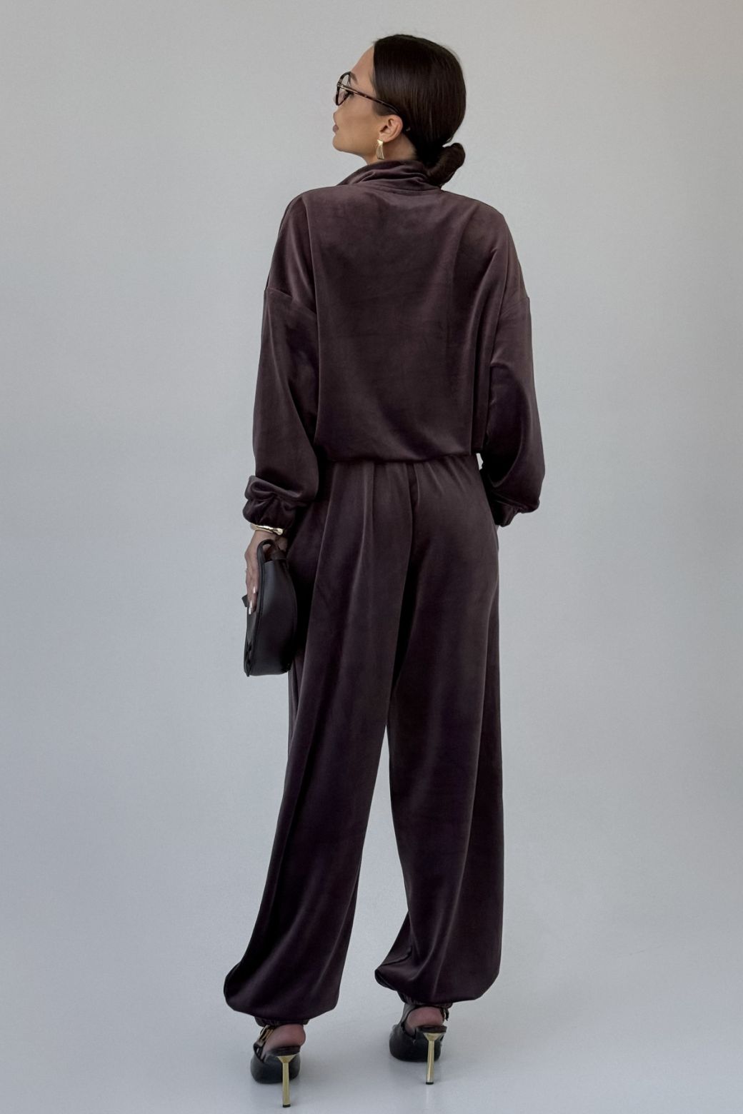 Костюм женский, выполнен из трикотажного велюра высокого качества. Костюм состоит из джемпера и брюк свободного силуэта. Верх и низ брюк обработан эластичной лентой в закрытом шве. В брюках расположены боковые функциональные карманы. Джемпер свободного силуэта, с молнией по переду. Низ рукава и низ джемпера обработан эластичной лентой в закрытом шве.
