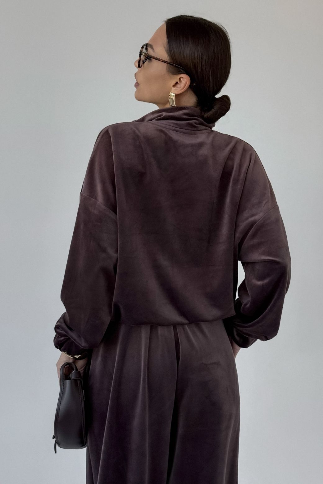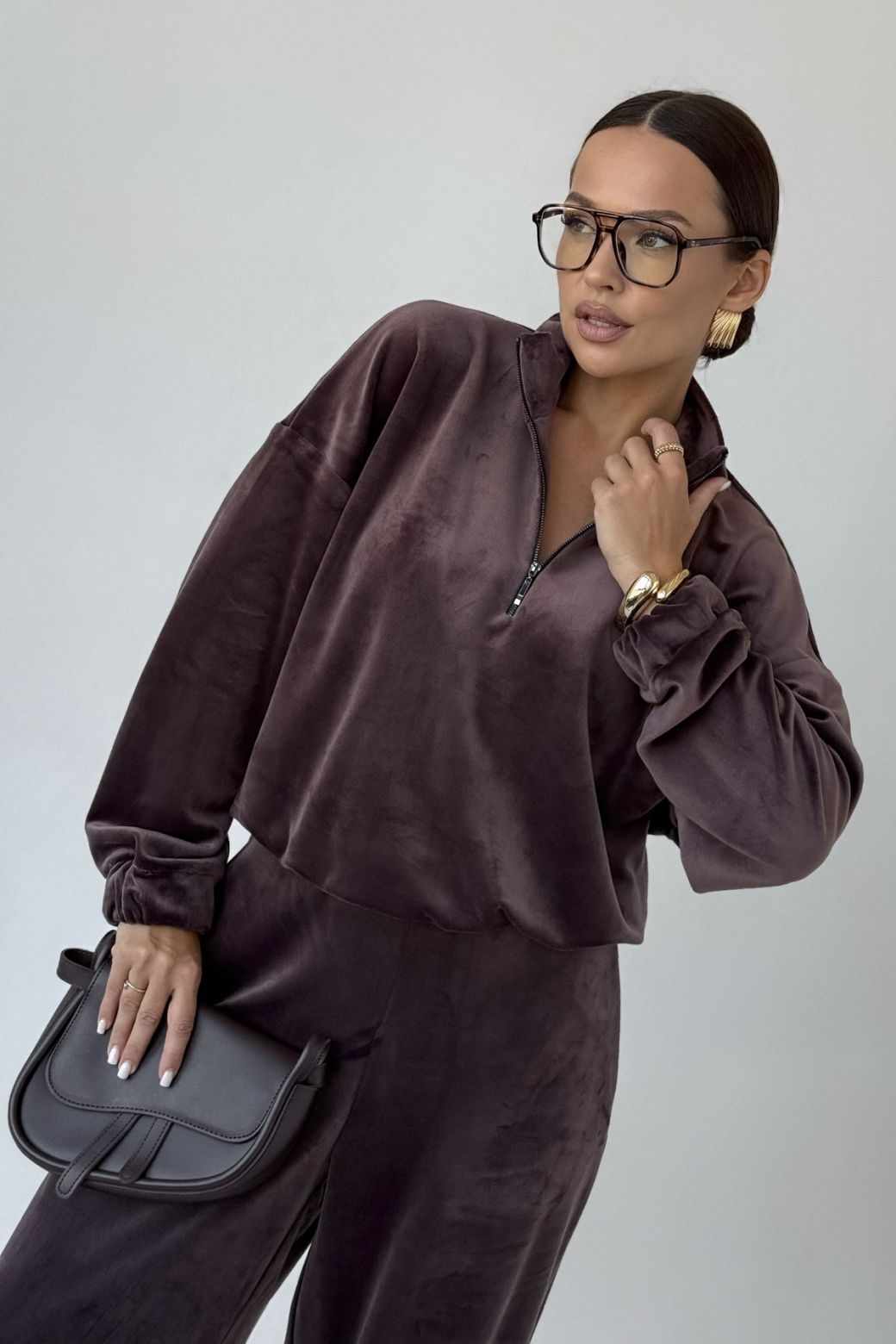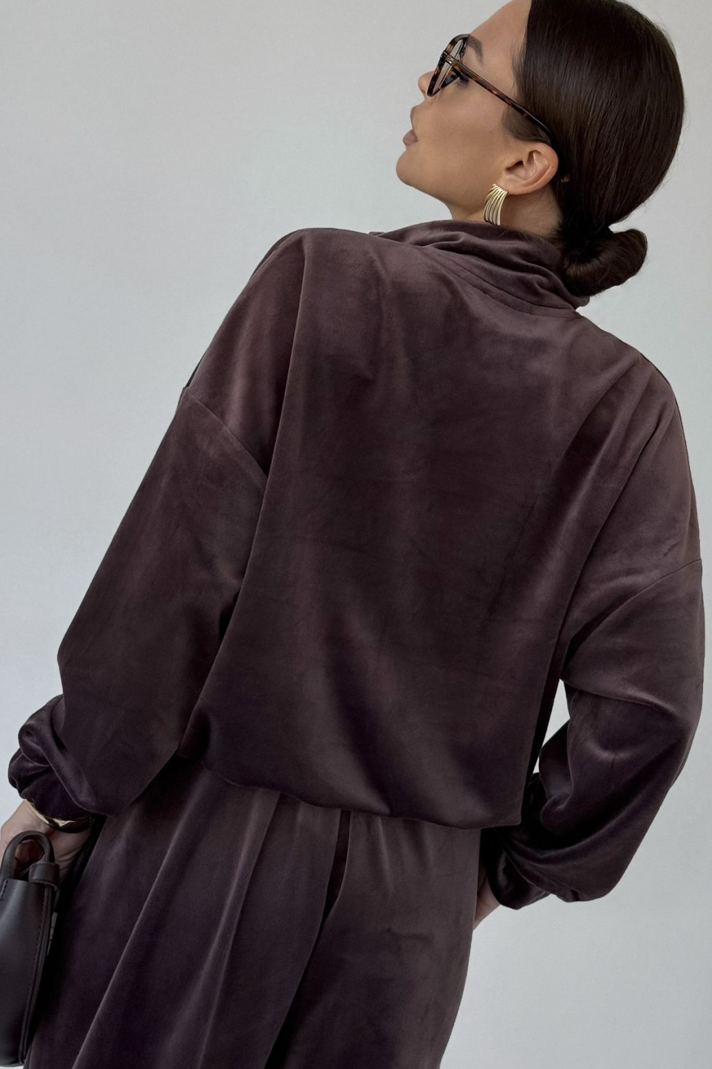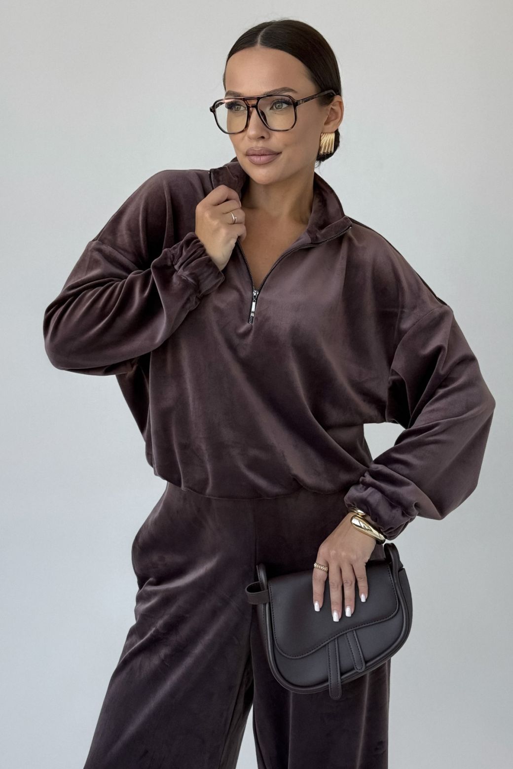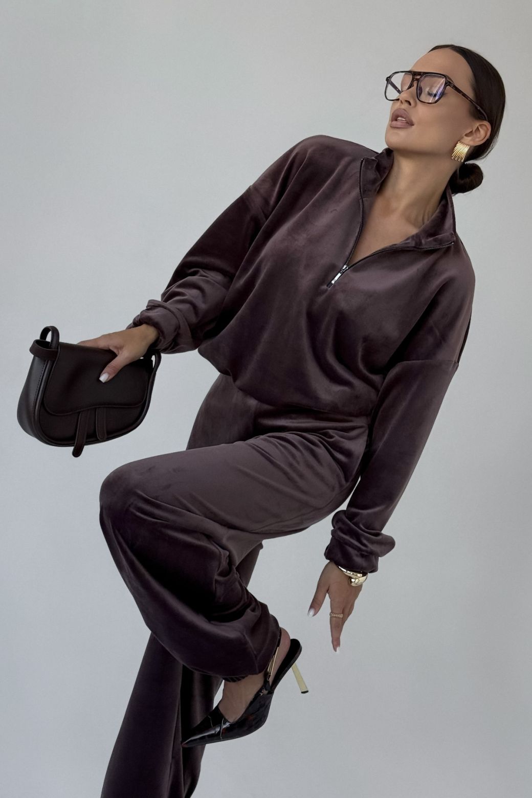 Костюм женский, выполнен из трикотажного велюра высокого качества. Костюм состоит из джемпера и брюк свободного силуэта. Верх и низ брюк обработан эластичной лентой в закрытом шве. В брюках расположены боковые функциональные карманы. Джемпер свободного силуэта, с молнией по переду. Низ рукава и низ джемпера обработан эластичной лентой в закрытом шве.