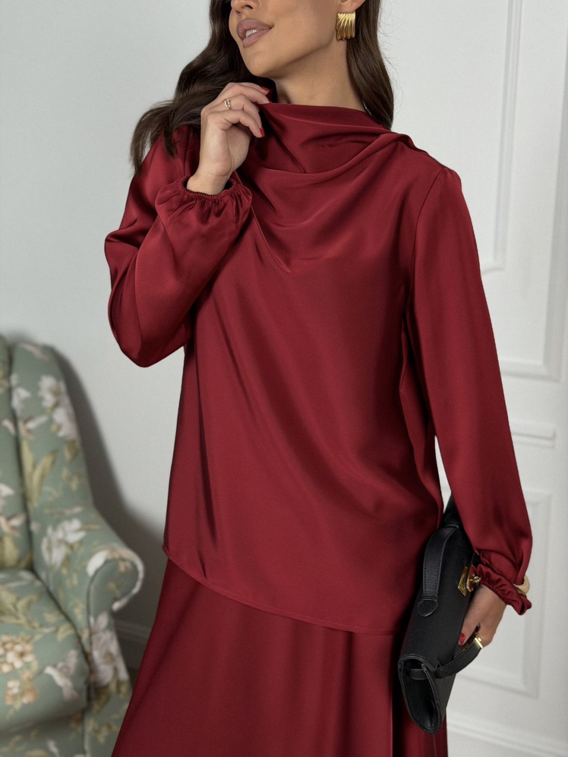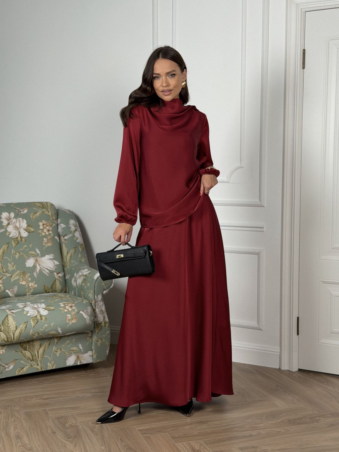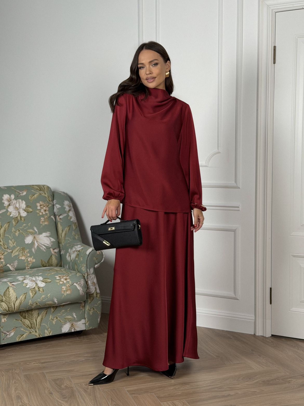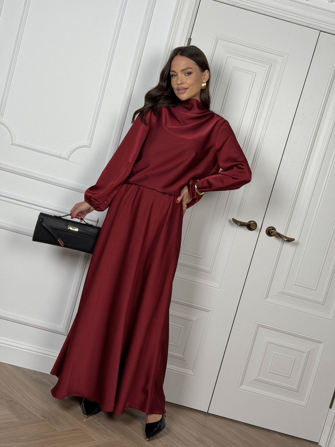 Комплект женский полуприлегающего силуэта , выполненный из исусственного шелка . Горловина в виде драпировки , рукав втачной одношовный со сборкой внизу рукава . В верхней части спинки разрез с пуговицей. Юбка женская , свободного силуэта выкроена по косой . Верхний край юбки обработан эластичной тесьмой (резинкой) с закрытым срезом .