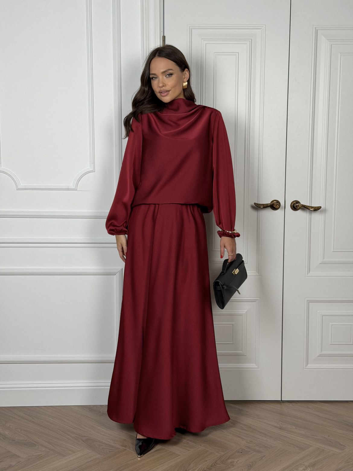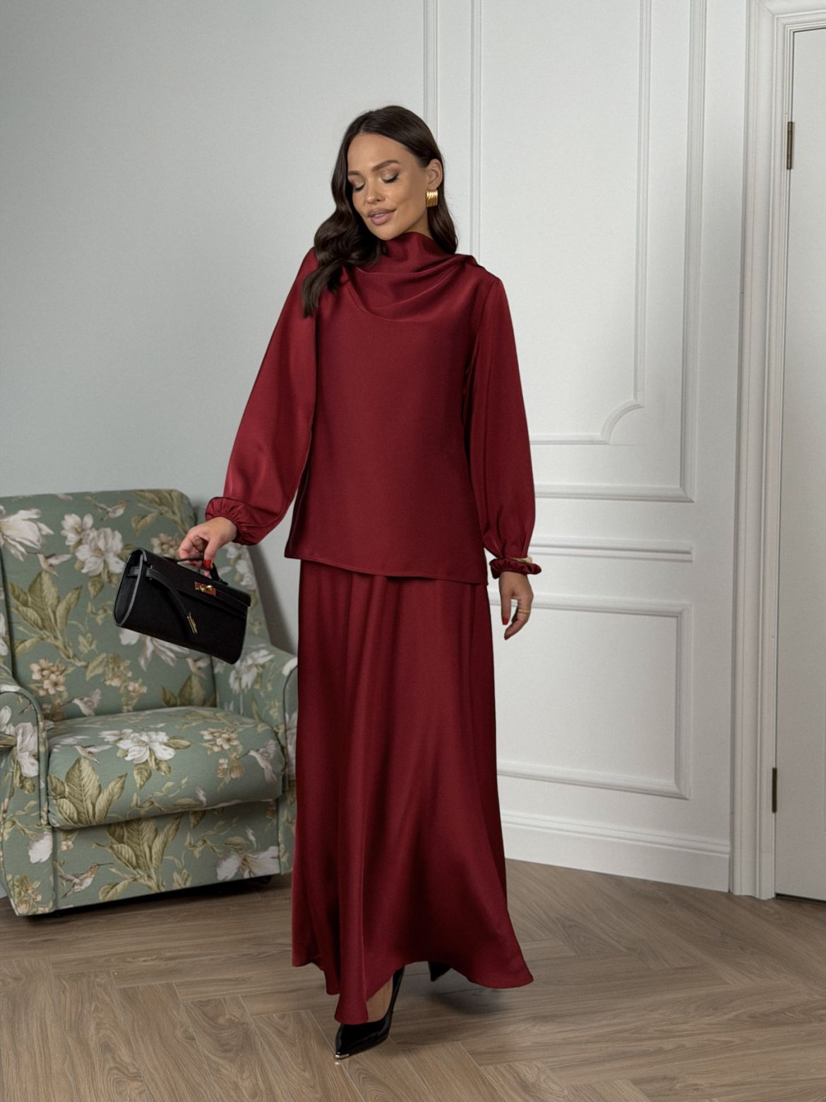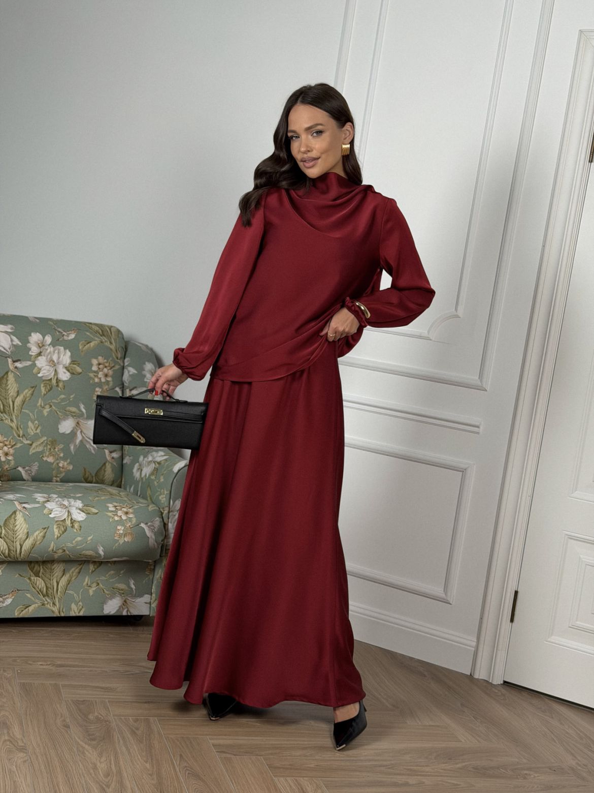Комплект женский полуприлегающего силуэта , выполненный из исусственного шелка . Горловина в виде драпировки , рукав втачной одношовный со сборкой внизу рукава . В верхней части спинки разрез с пуговицей. Юбка женская , свободного силуэта выкроена по косой . Верхний край юбки обработан эластичной тесьмой (резинкой) с закрытым срезом .