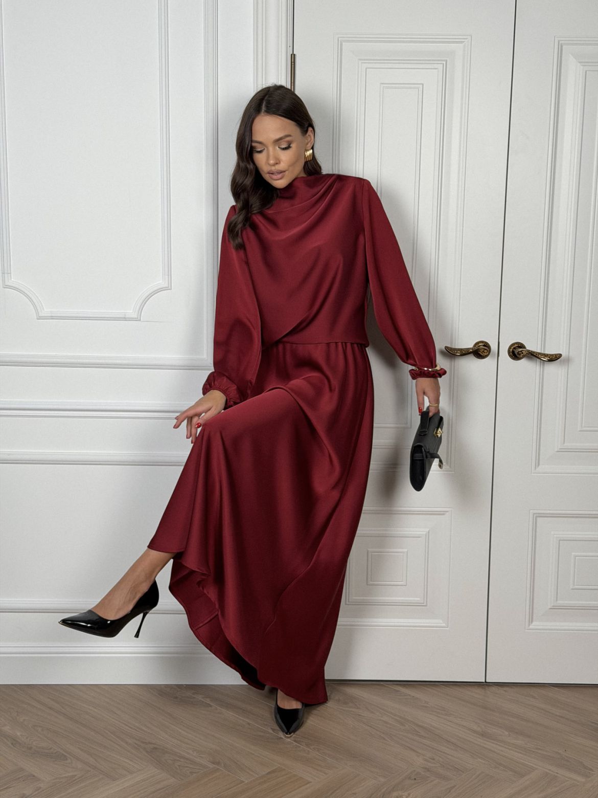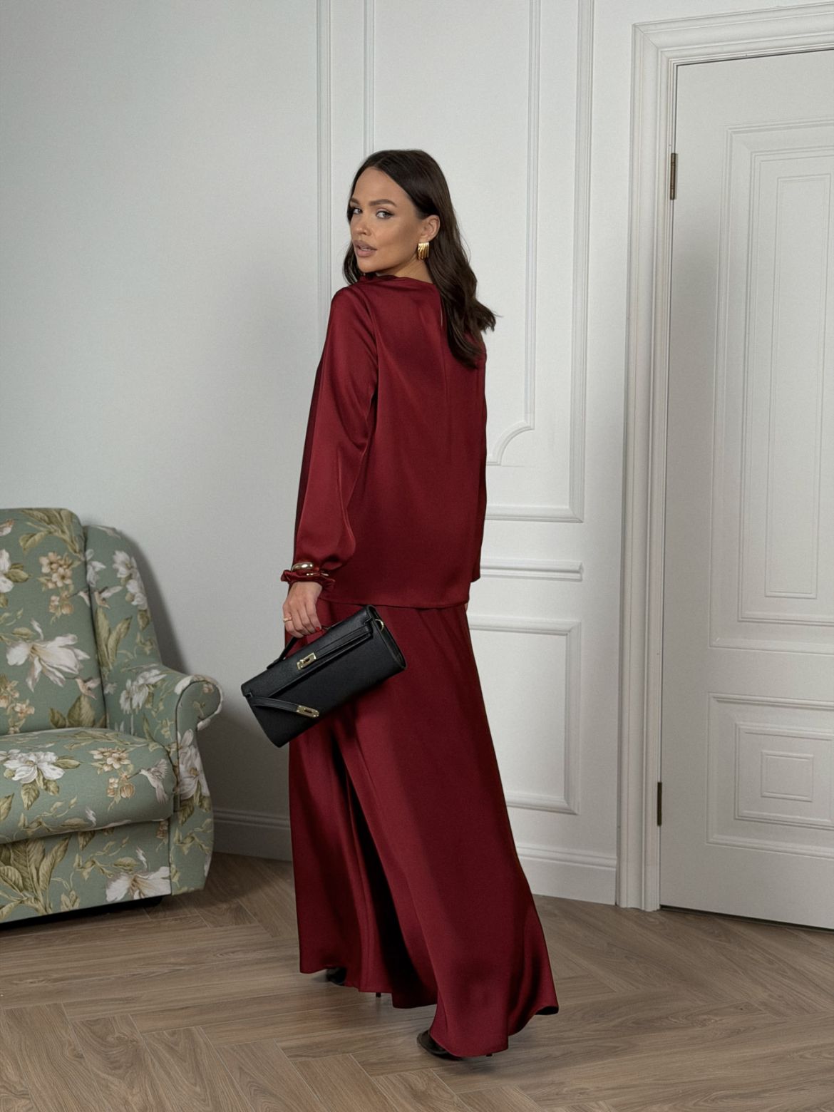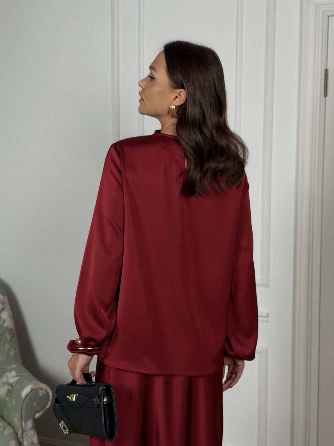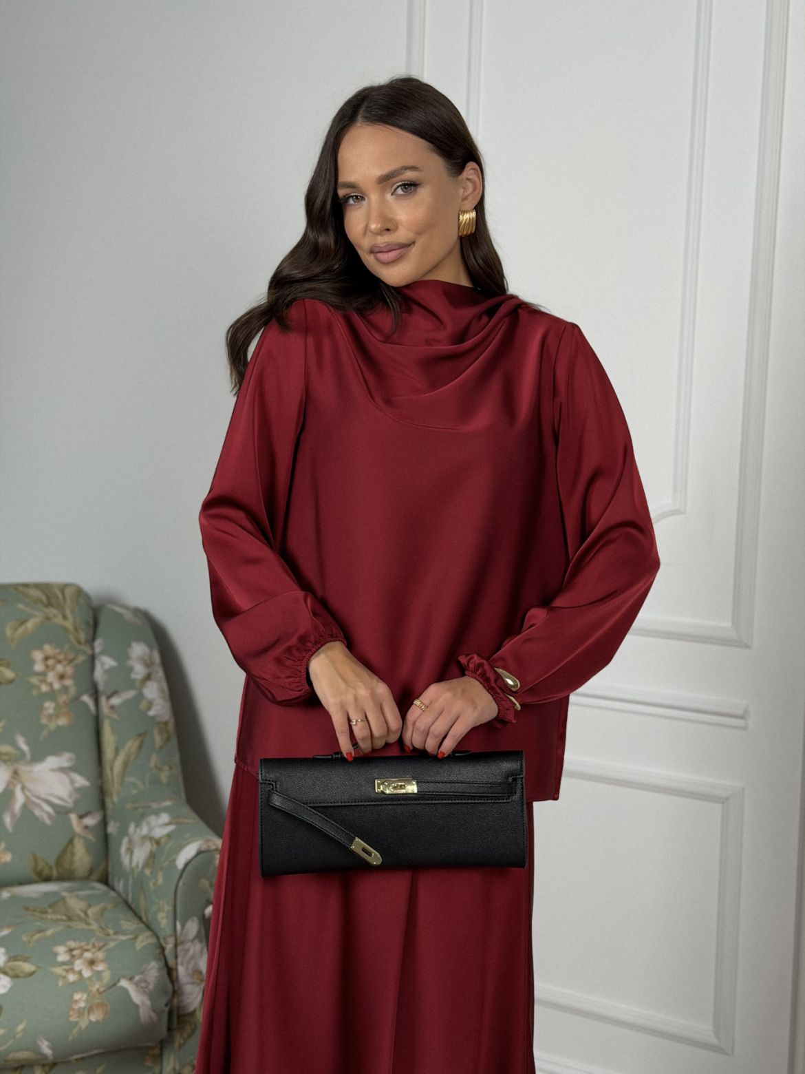 Комплект женский полуприлегающего силуэта , выполненный из исусственного шелка . Горловина в виде драпировки , рукав втачной одношовный со сборкой внизу рукава . В верхней части спинки разрез с пуговицей. Юбка женская , свободного силуэта выкроена по косой . Верхний край юбки обработан эластичной тесьмой (резинкой) с закрытым срезом .