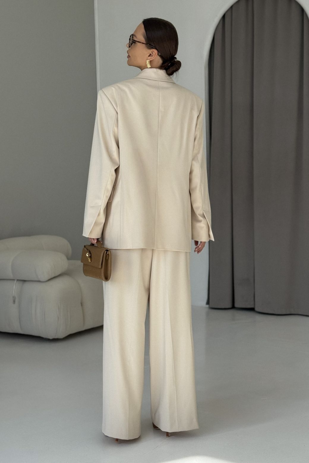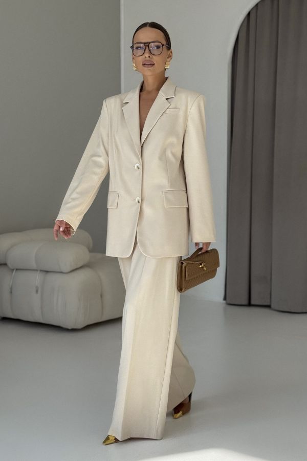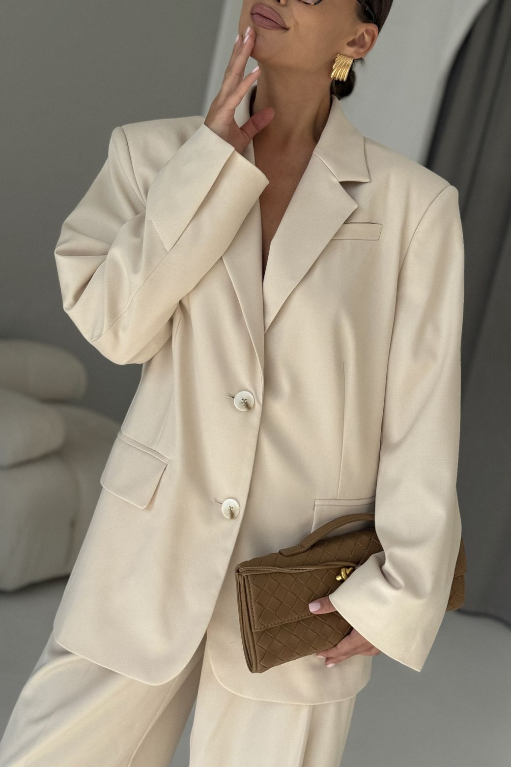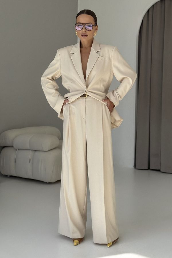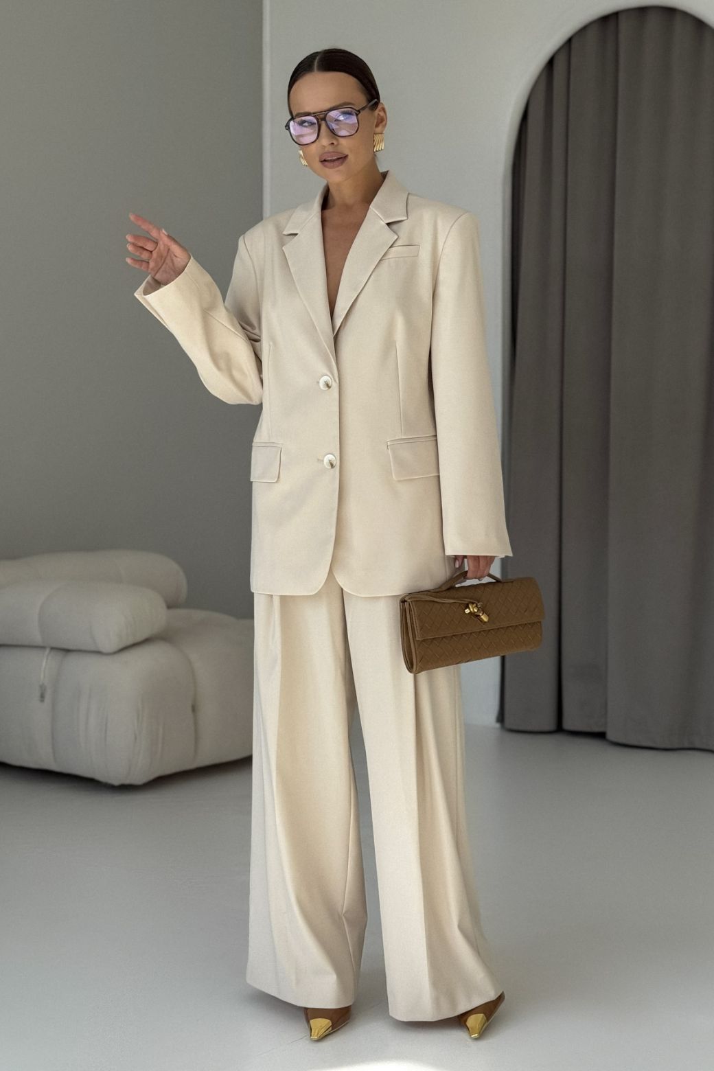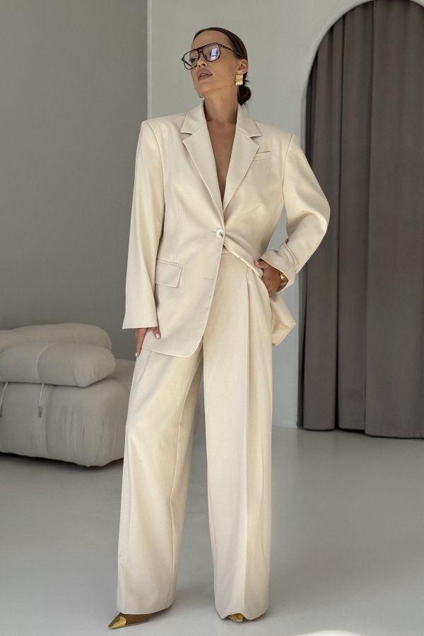 Костюм женский двухпредметный, свободного силуэта, выполненный из костюмной ткани высокого качества. Жакет с однобортной застежкой, рукав втачной двухшовный с декоративной шлицей снизу. Воротник стояче - отложной с отворотами лацканов. По переду жакета также функциональные карманы с клапанами, а также нагрудный карман. Жакет на подкладке. Брюки свободного силуэта со складками и карманами вверху, сзади брюк также функциональный карман с клапаном. Верх брюк обработан подкройным поясом.