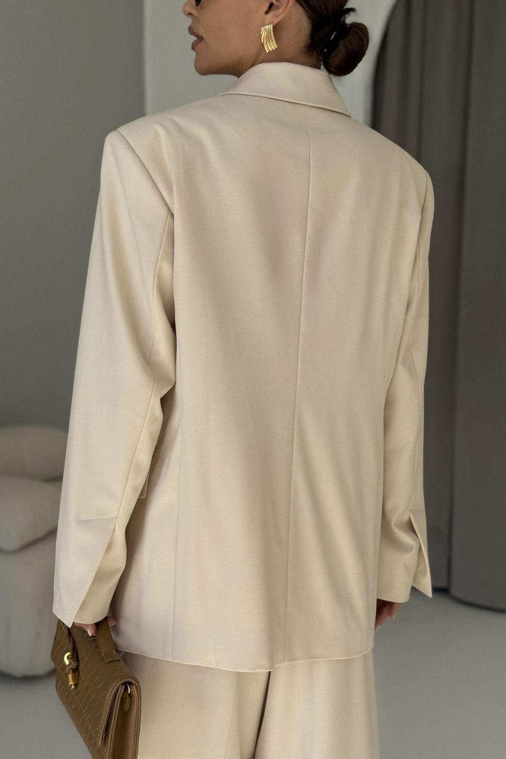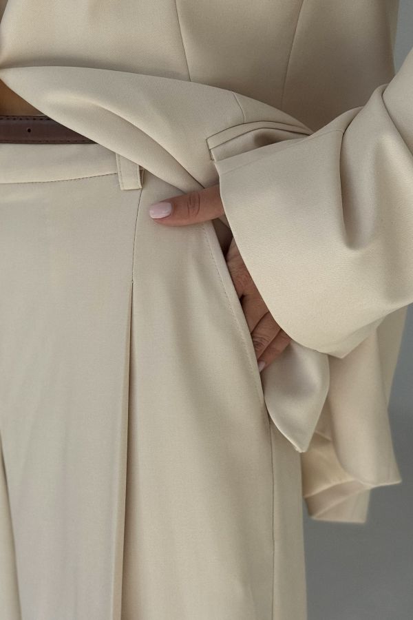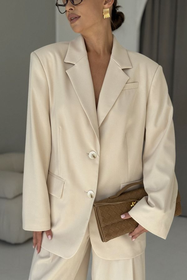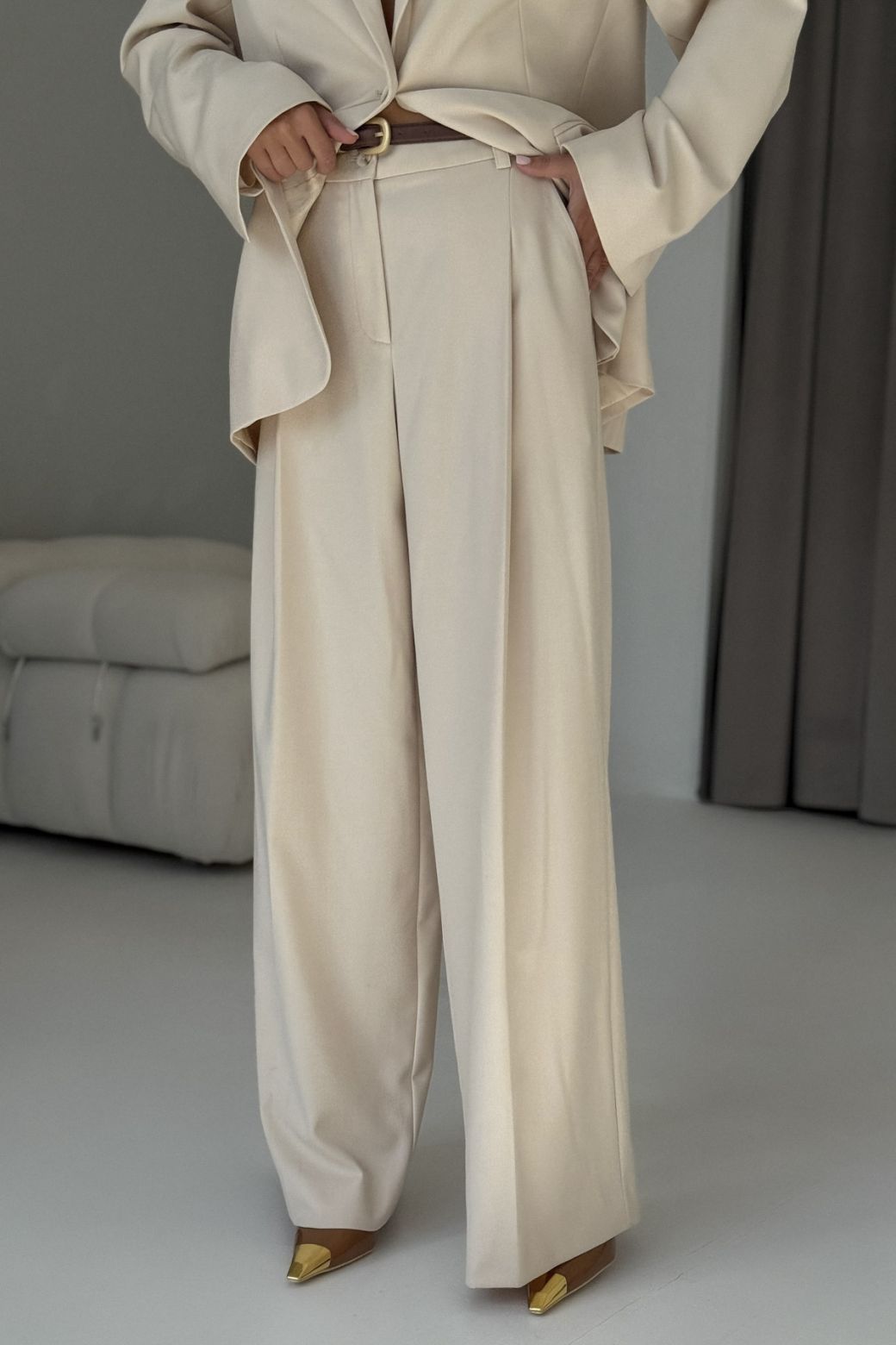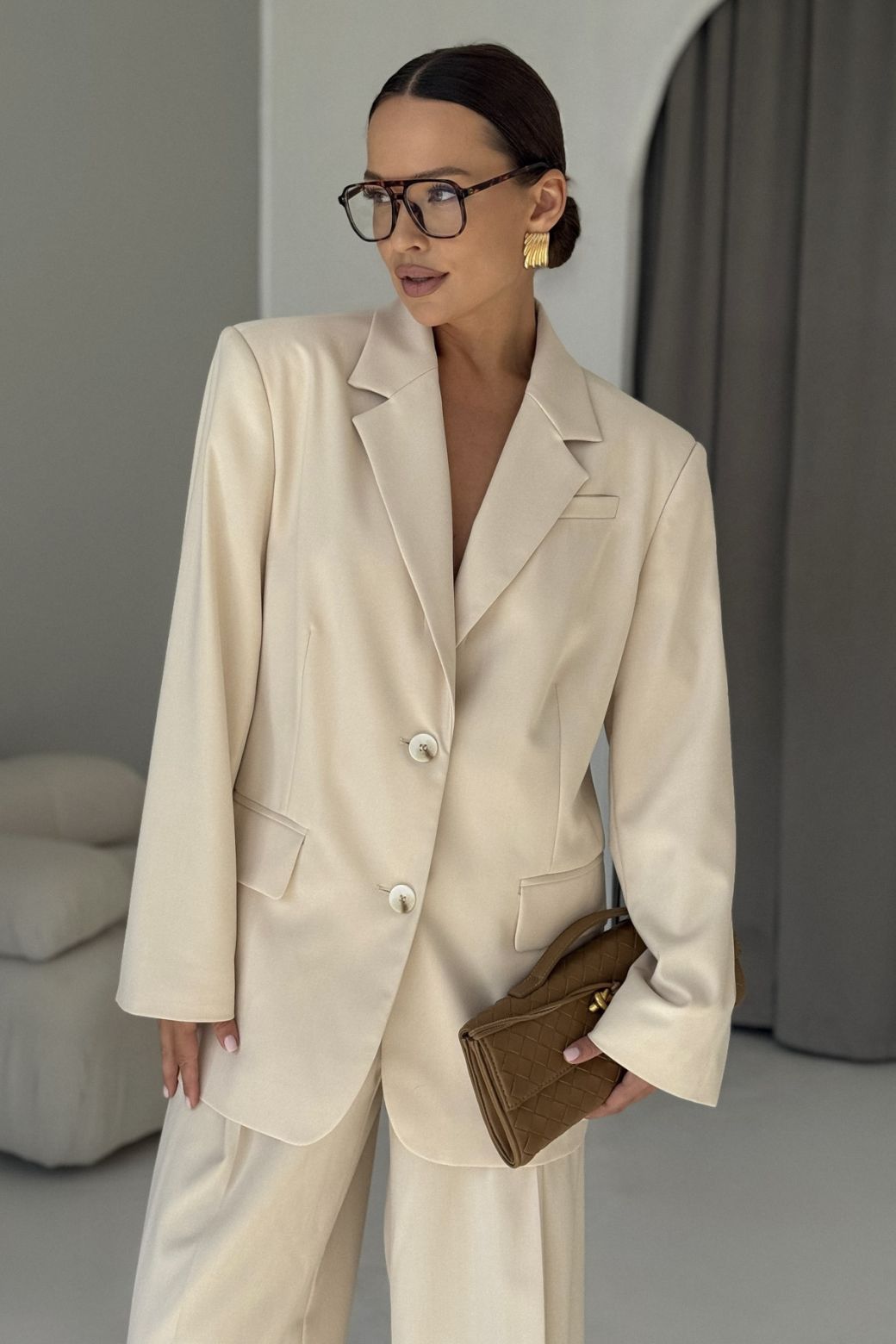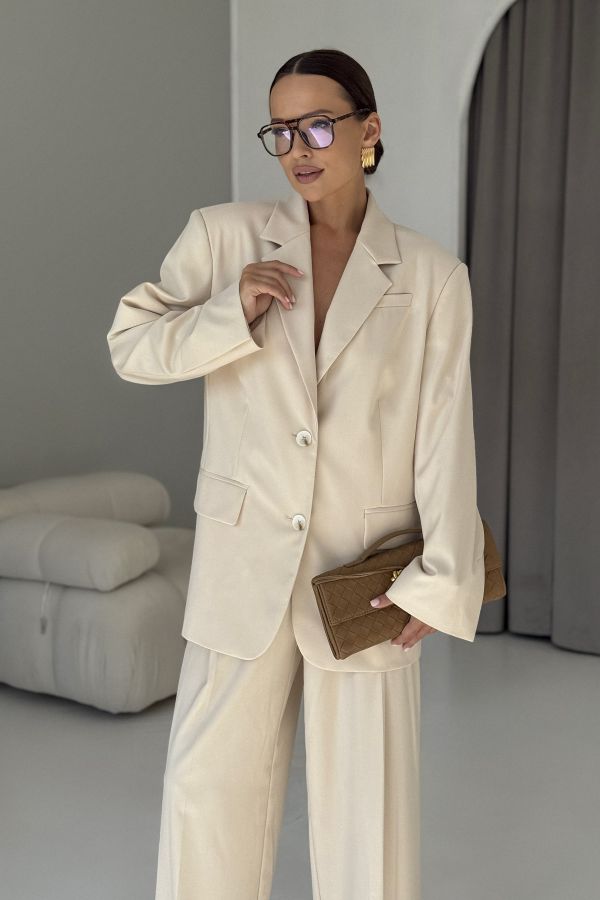 Костюм женский двухпредметный, свободного силуэта, выполненный из костюмной ткани высокого качества. Жакет с однобортной застежкой, рукав втачной двухшовный с декоративной шлицей снизу. Воротник стояче - отложной с отворотами лацканов. По переду жакета также функциональные карманы с клапанами, а также нагрудный карман. Жакет на подкладке. Брюки свободного силуэта со складками и карманами вверху, сзади брюк также функциональный карман с клапаном. Верх брюк обработан подкройным поясом.