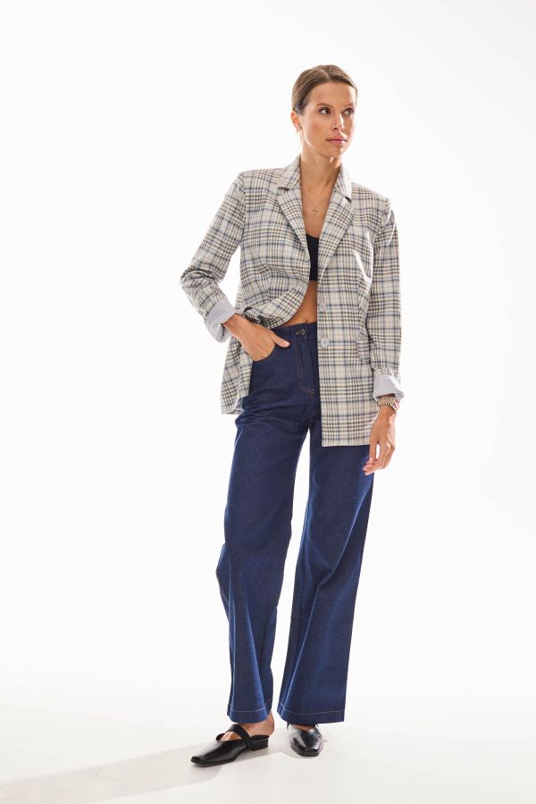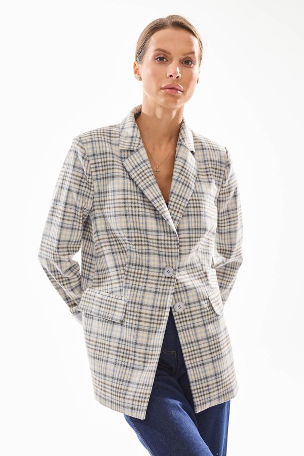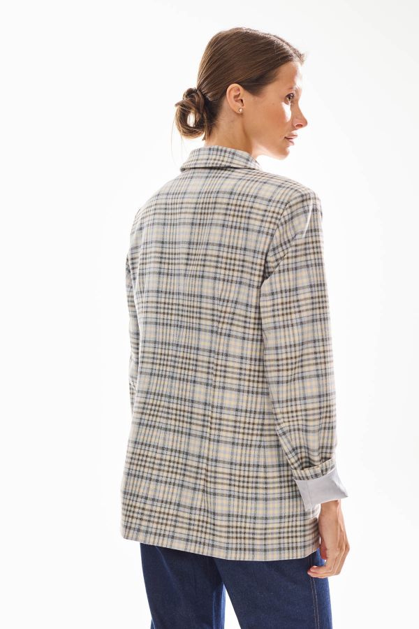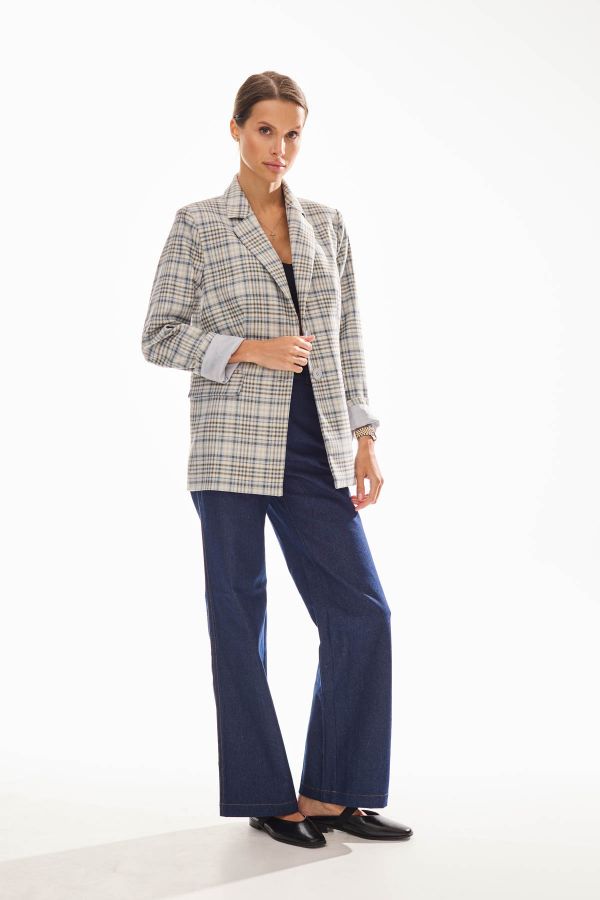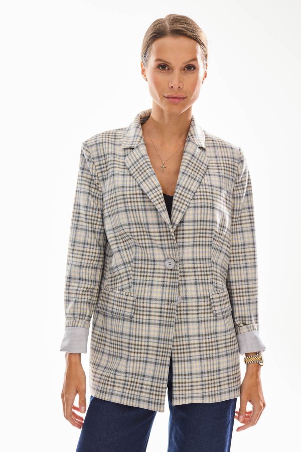 Жакет женский полуприлегающего силуэта, выполненный из костюмной ткани высокого качества. Жакет с центральной застежкой, рукав втачной двухшовный, внизу рукава шлица. Воротник стояче - отложной с отворотами лацканов. По переду жакета также функциональные карманы с клапанами. Жакет на подкладке.