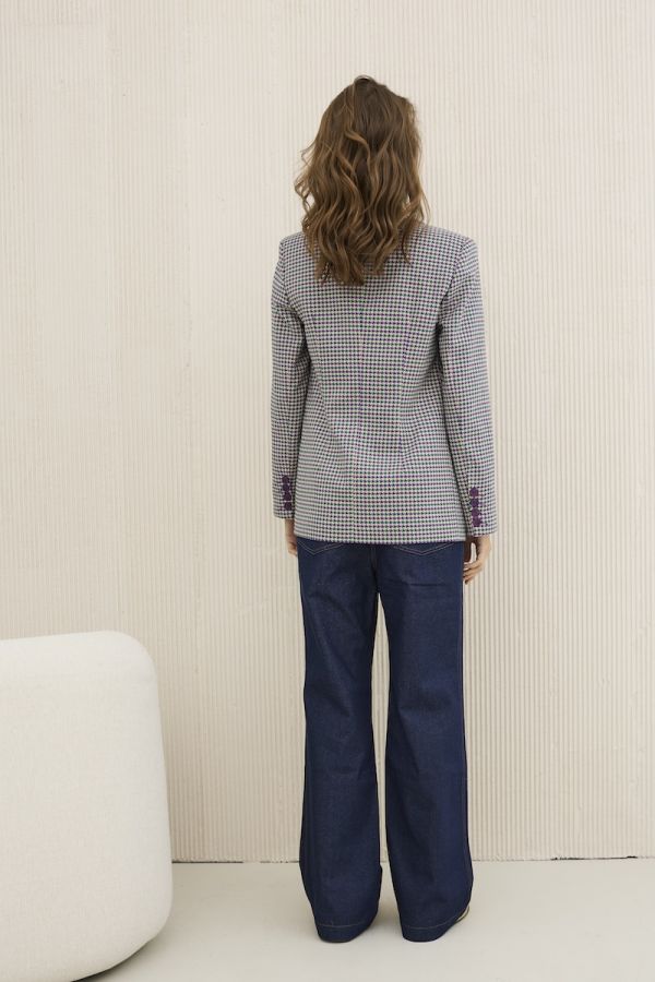 Жакет женский полуприлегающего силуэта , выполненный из костюмной ткани высокого качества . Жакет с центральной застежкой , рукав втачной двухшовный , внизу рукава шлица. Воротник стояче - отложной с отворотами лацканов . По переду жакета также функциональные карманы с клапанами . Жакет на подкладке.