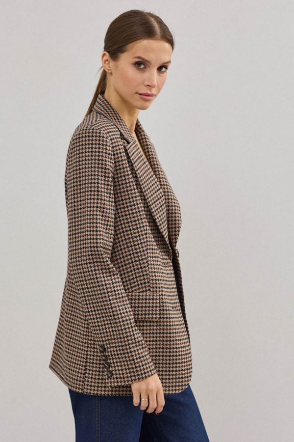 Жакет женский полуприлегающего силуэта, выполненный из костюмной ткани высокого качества. Жакет с центральной застежкой, рукав втачной двухшовный, внизу рукава шлица. Воротник стояче - отложной с отворотами лацканов. По переду жакета также функциональные карманы с клапанами. Жакет на подкладке.