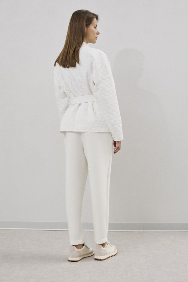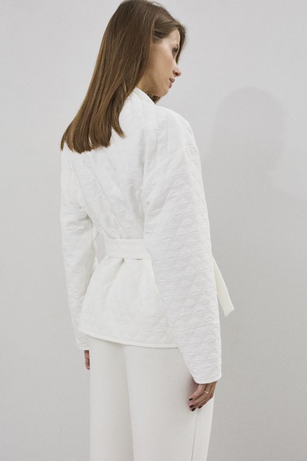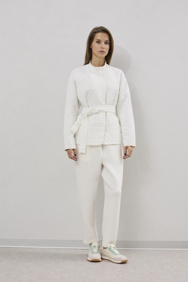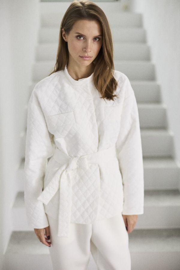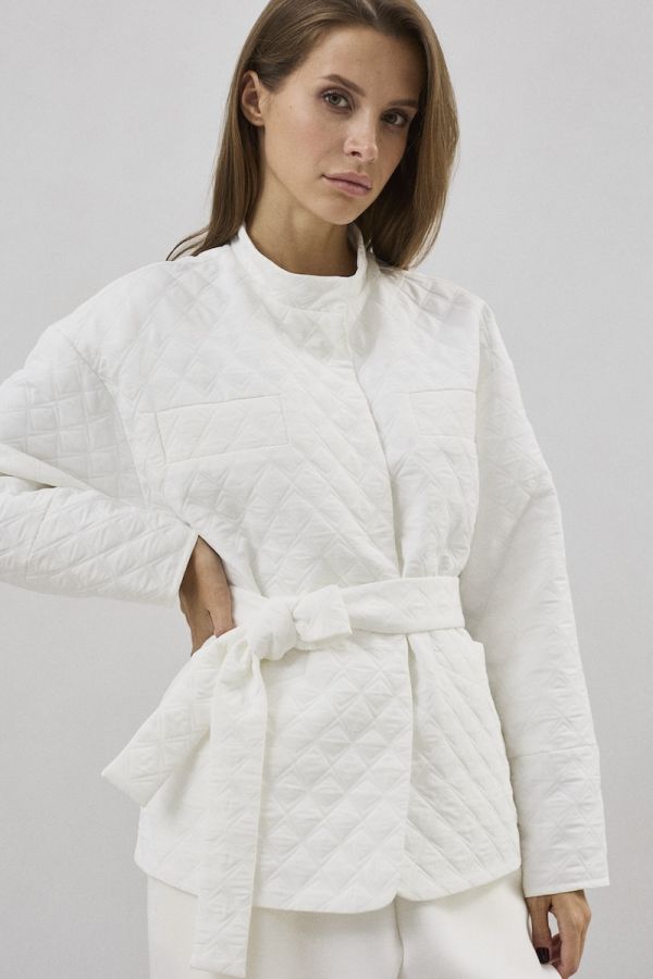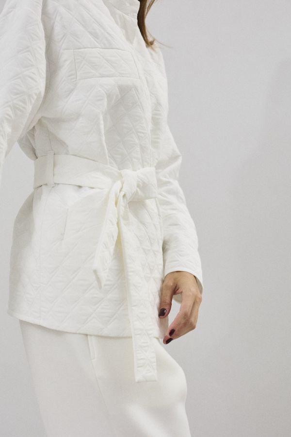 Жакет женский утепленный , полуприлегающего силуэта, выполненный из фактурной двухслойной ткани . Жакет с центральной застежкой на пришивных кнопках. Рукав спущенный одношовный. Воротник в виде невысокой стойки. По переду жакета подкладка, а также функциональные карманы. В комплекте также пояс из основной ткани.