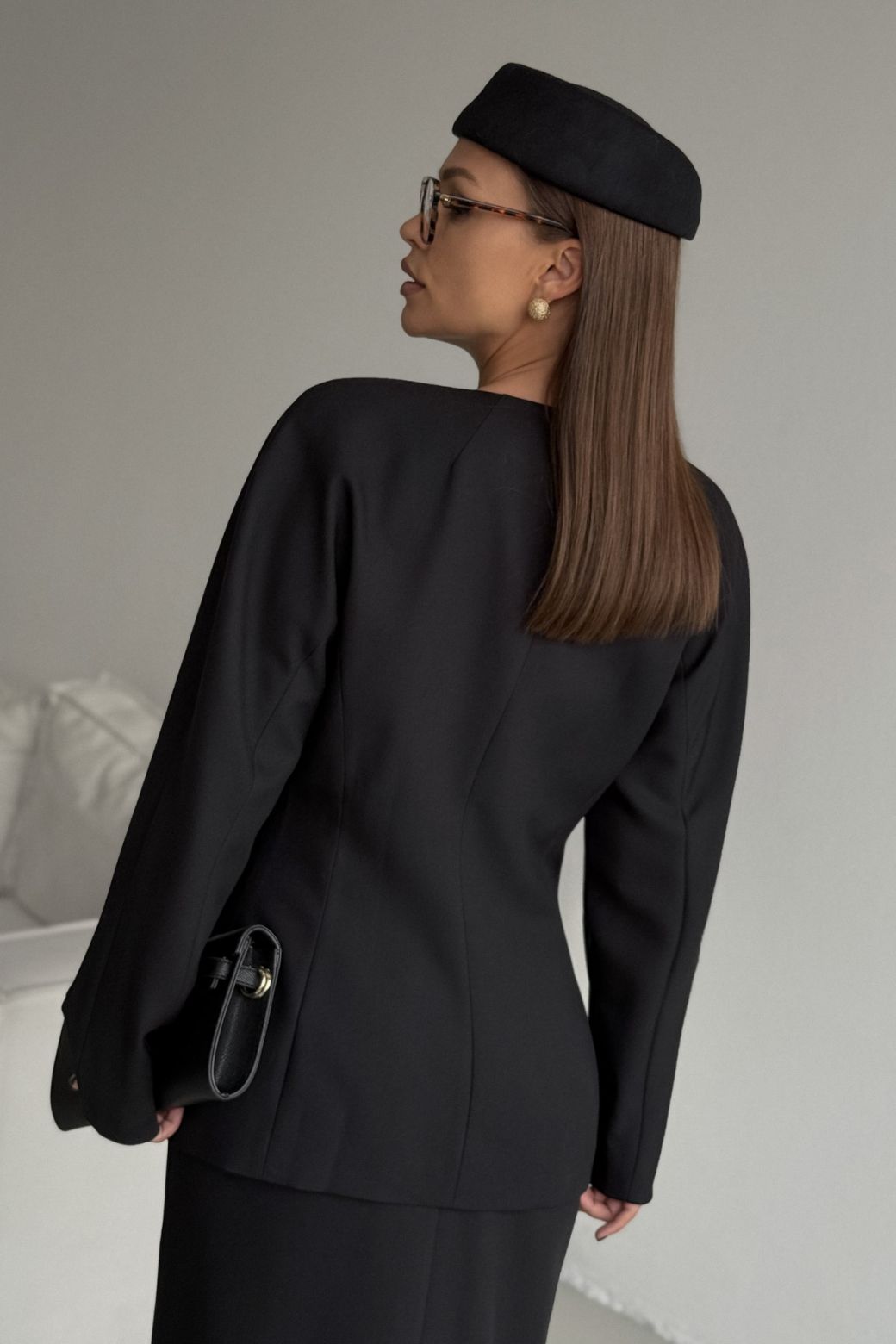 Жакет женский приталенного Ф-силуэта, выполнен из костюмной ткани.Застежка потайная на петли и пуговицы. Рукав цельновыкроеннный двухшовный.