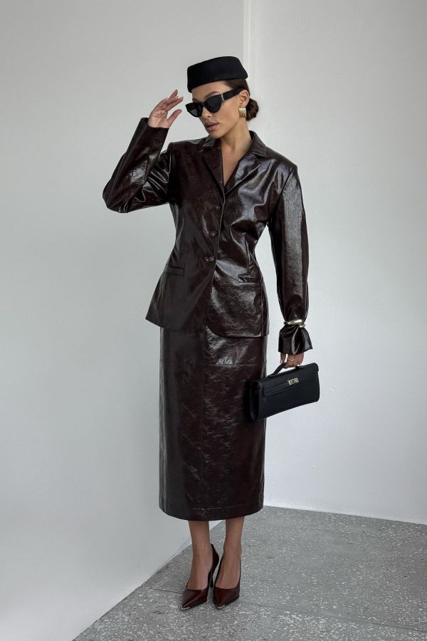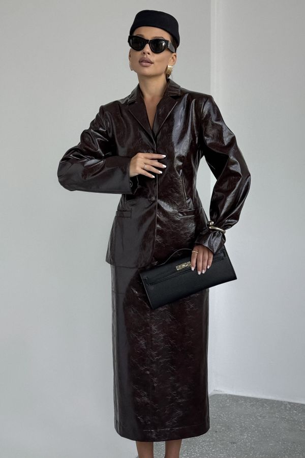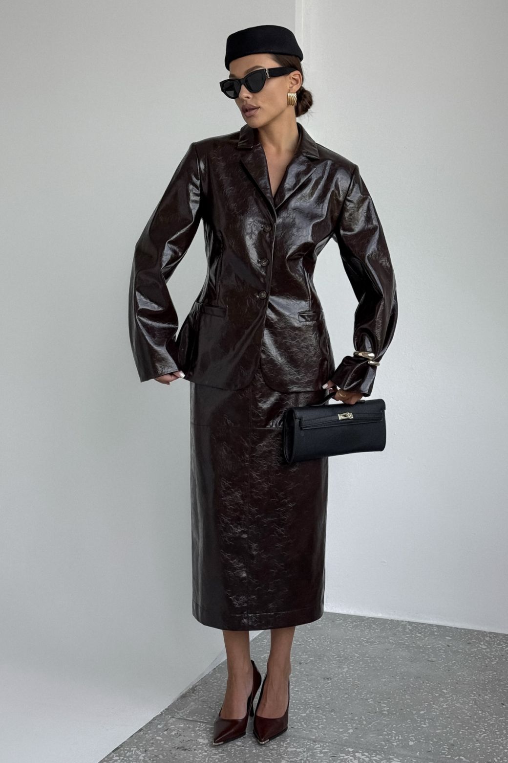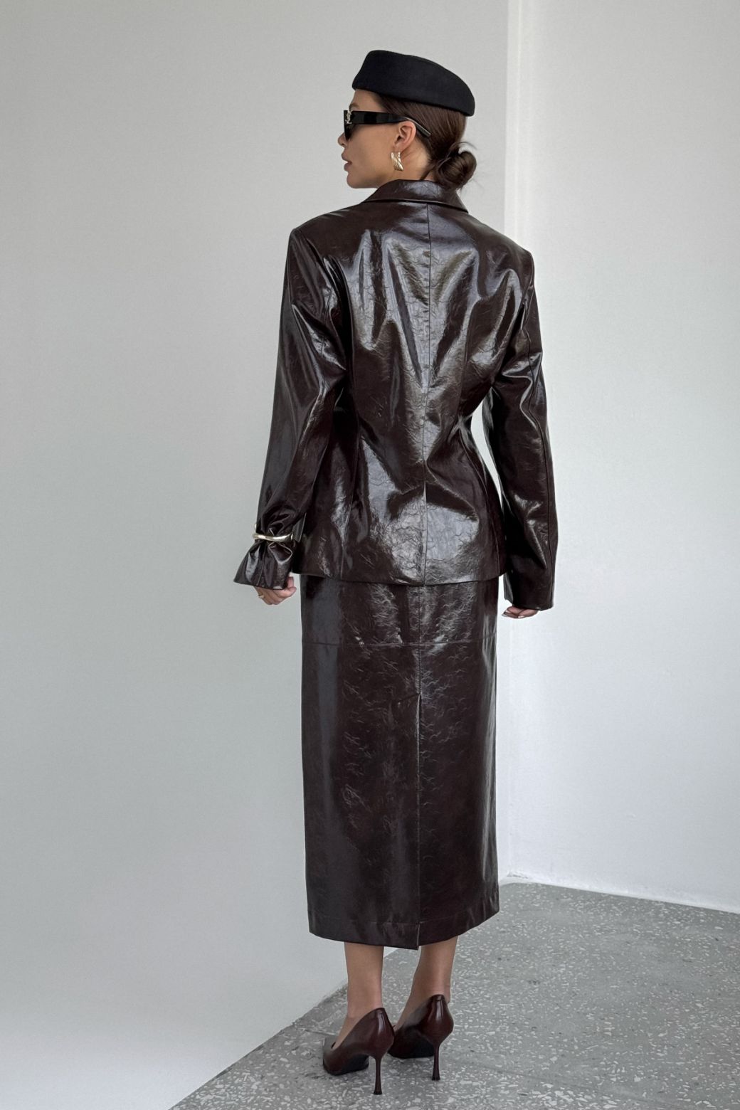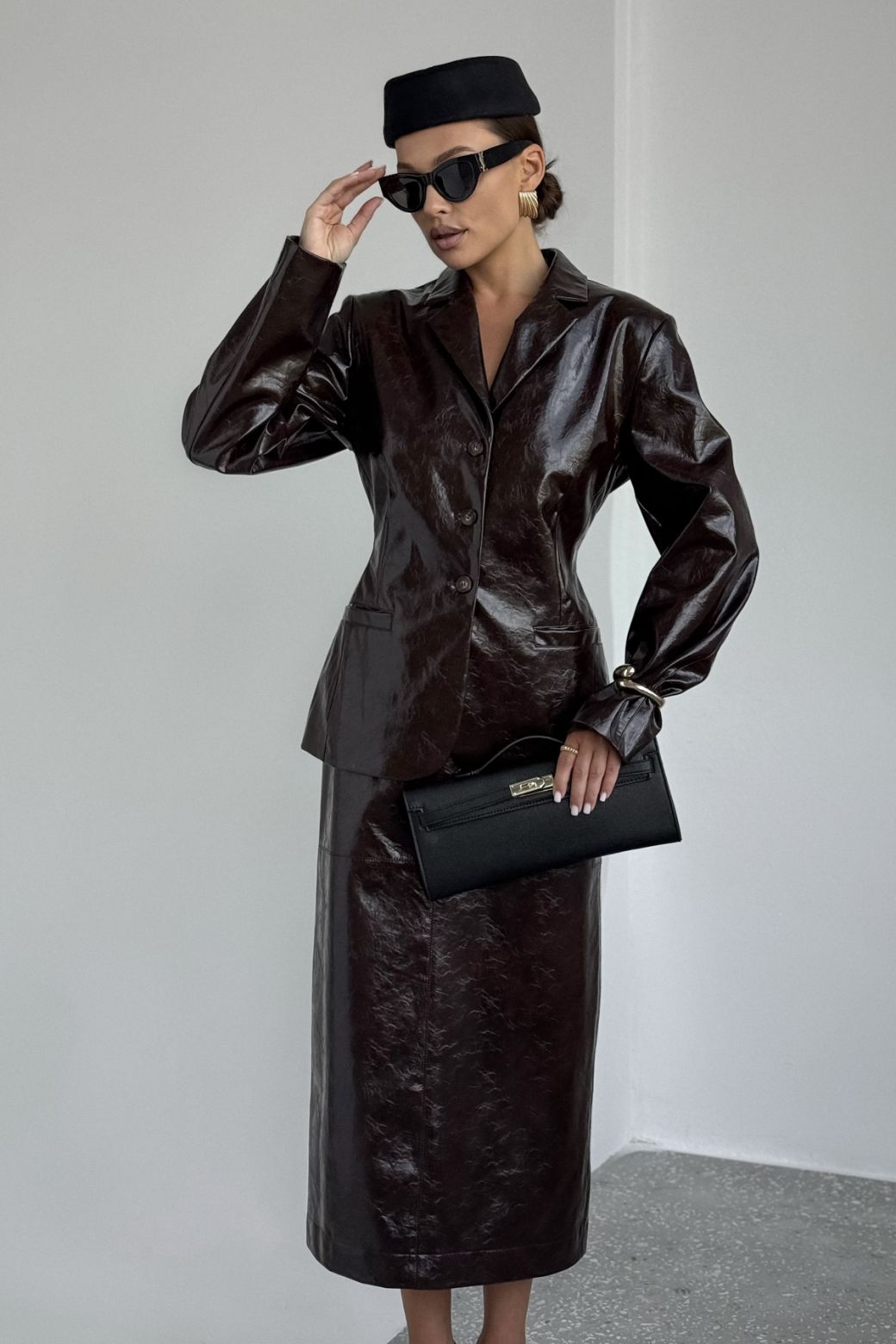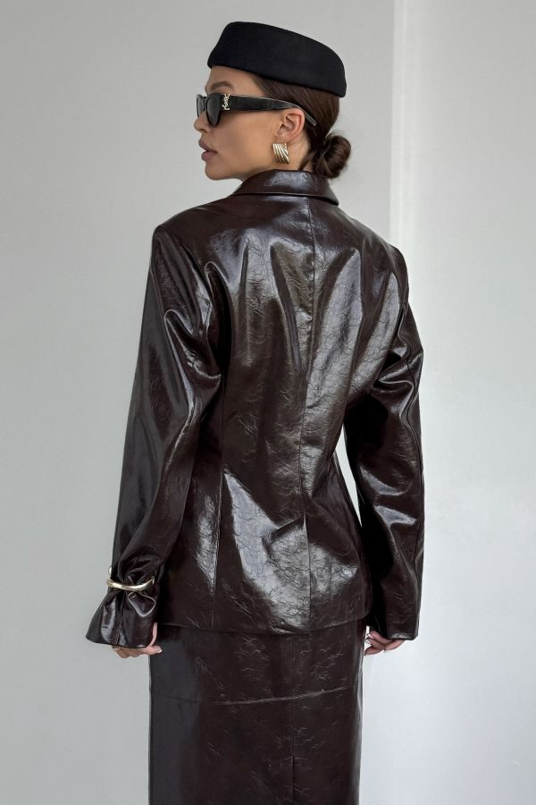 Жакет женский приталенного силуэта, выполнен из искусственной кожи, жакет на подкладке. Вортник стояче - отложной с отворотами лацканов, застежка центральная на петли и пуговицы. Рукав втачной двухшовный. По переду жакета прорезные карманы с клапанами. Сзади жакета по среднему шву шлица.