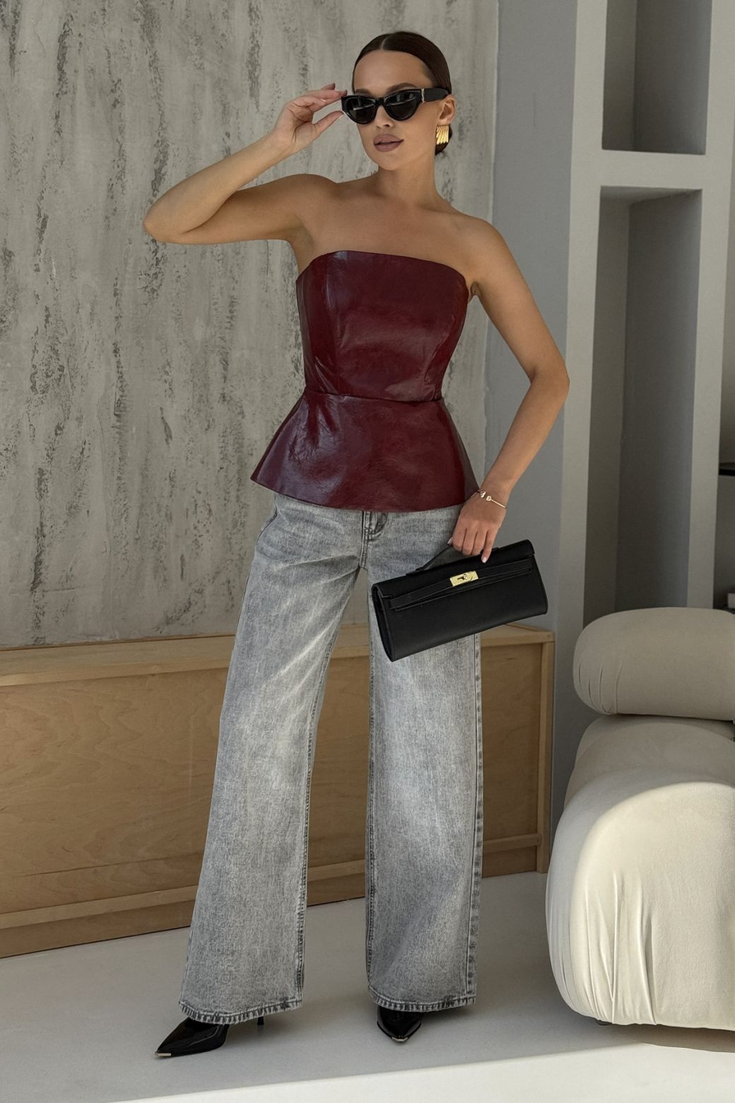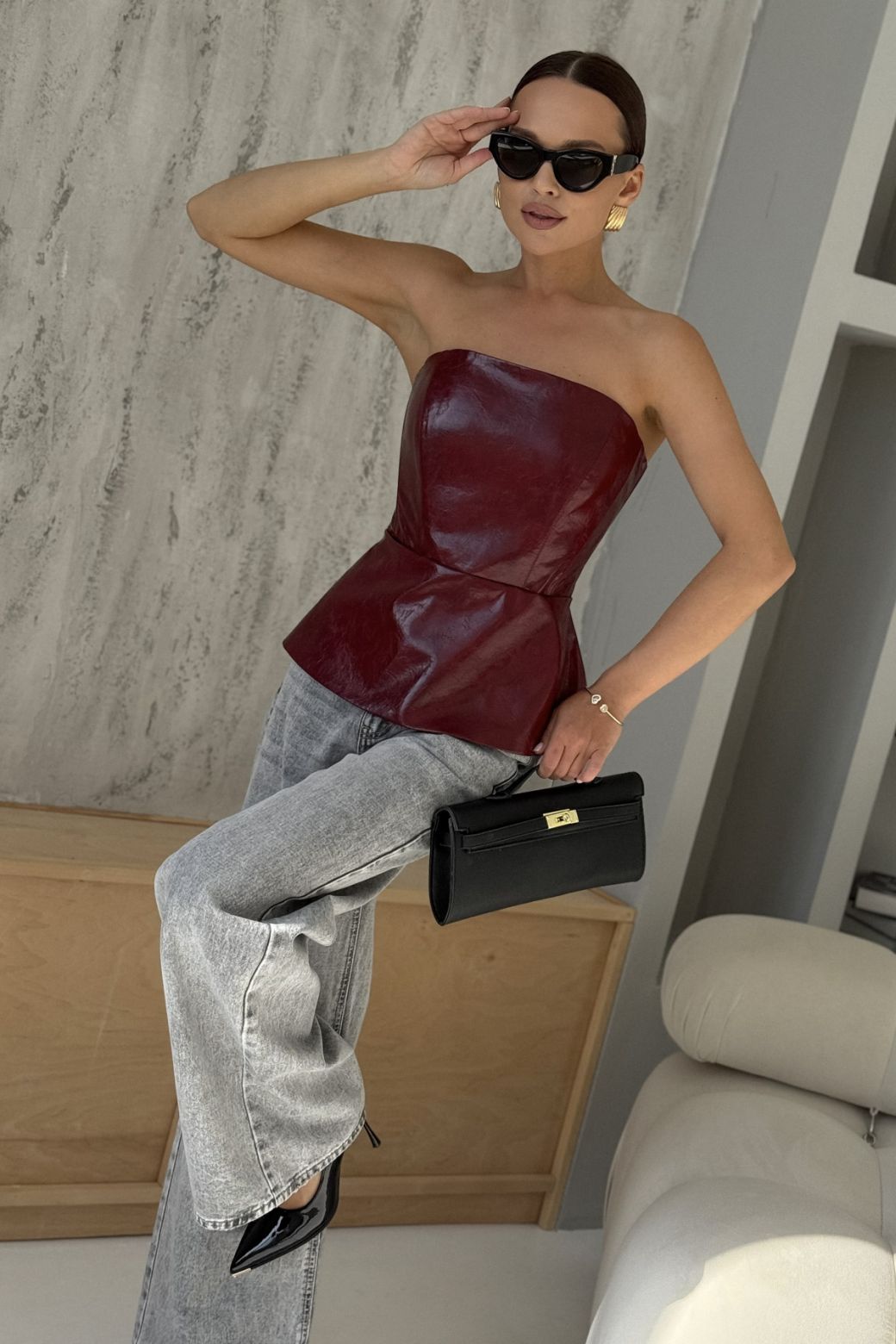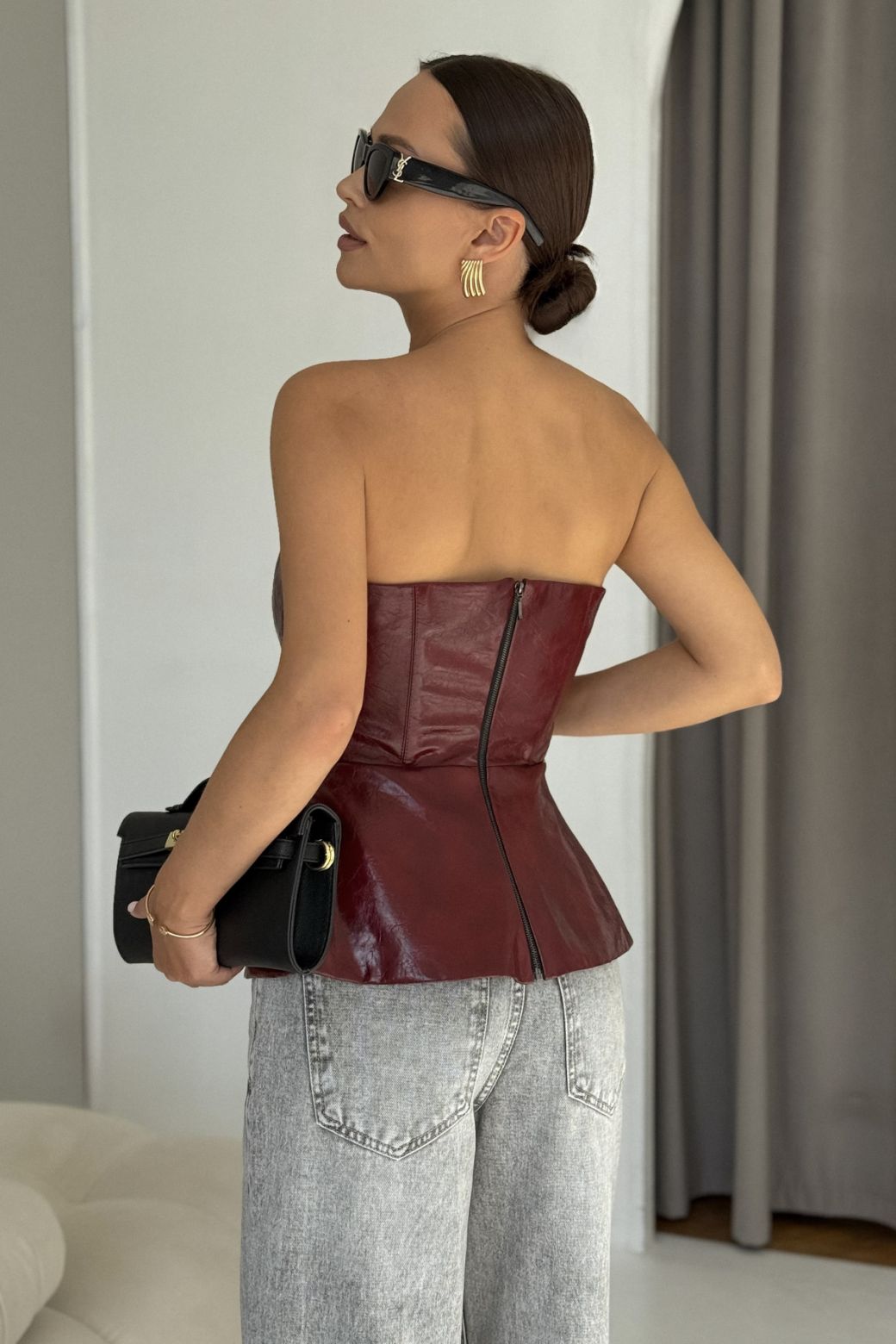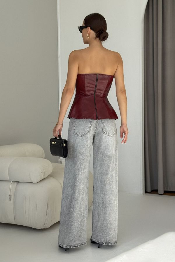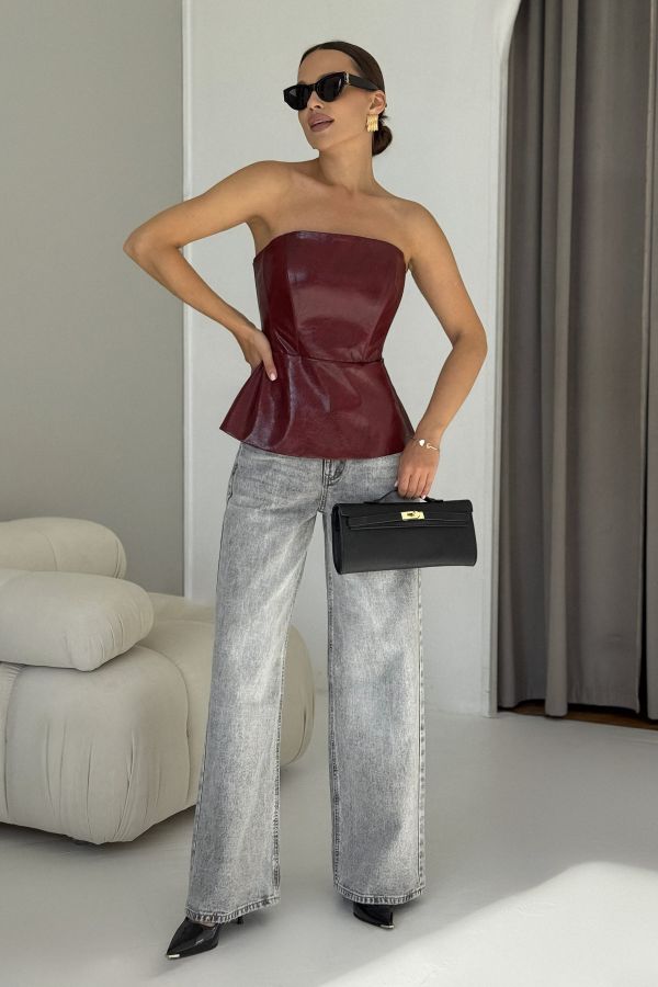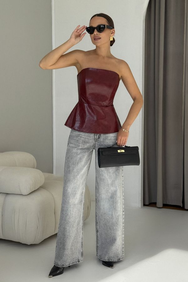 Жилет - бандо, приталенного силуэта, выполнен из искусственной кожи высокого качества. По линии талии подрез, с оригинальной баской. Застежка сзади на разъемную декоративную молнию. Швы данного изделия уплотнены корсетной летной, для четкого силуэта.