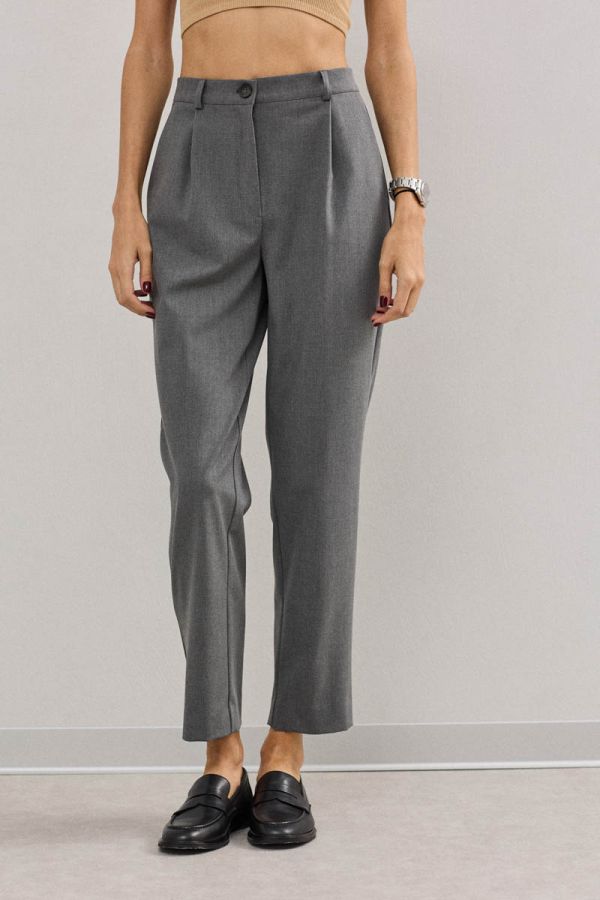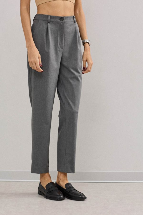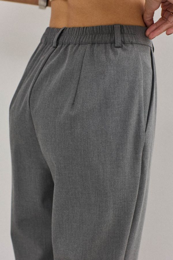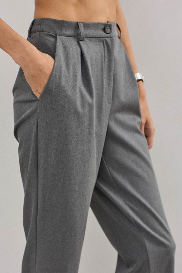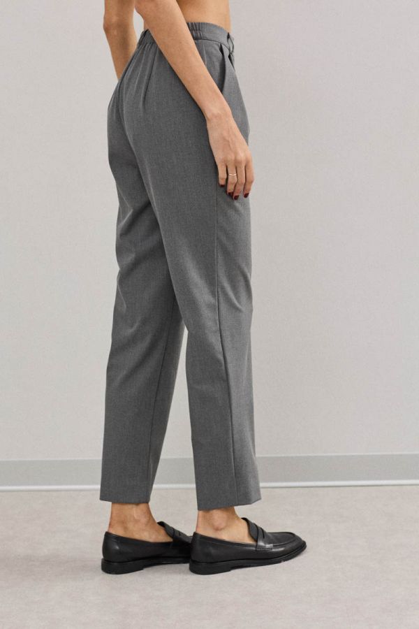 Брюки полуприлегающего силуэта, зауженные книзу. Со складками и функциональными карманами вверху. Верх брюк обработан поясом с резинкой по спинке .