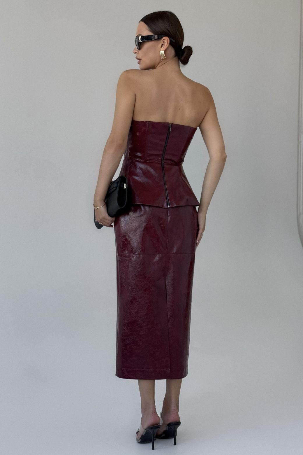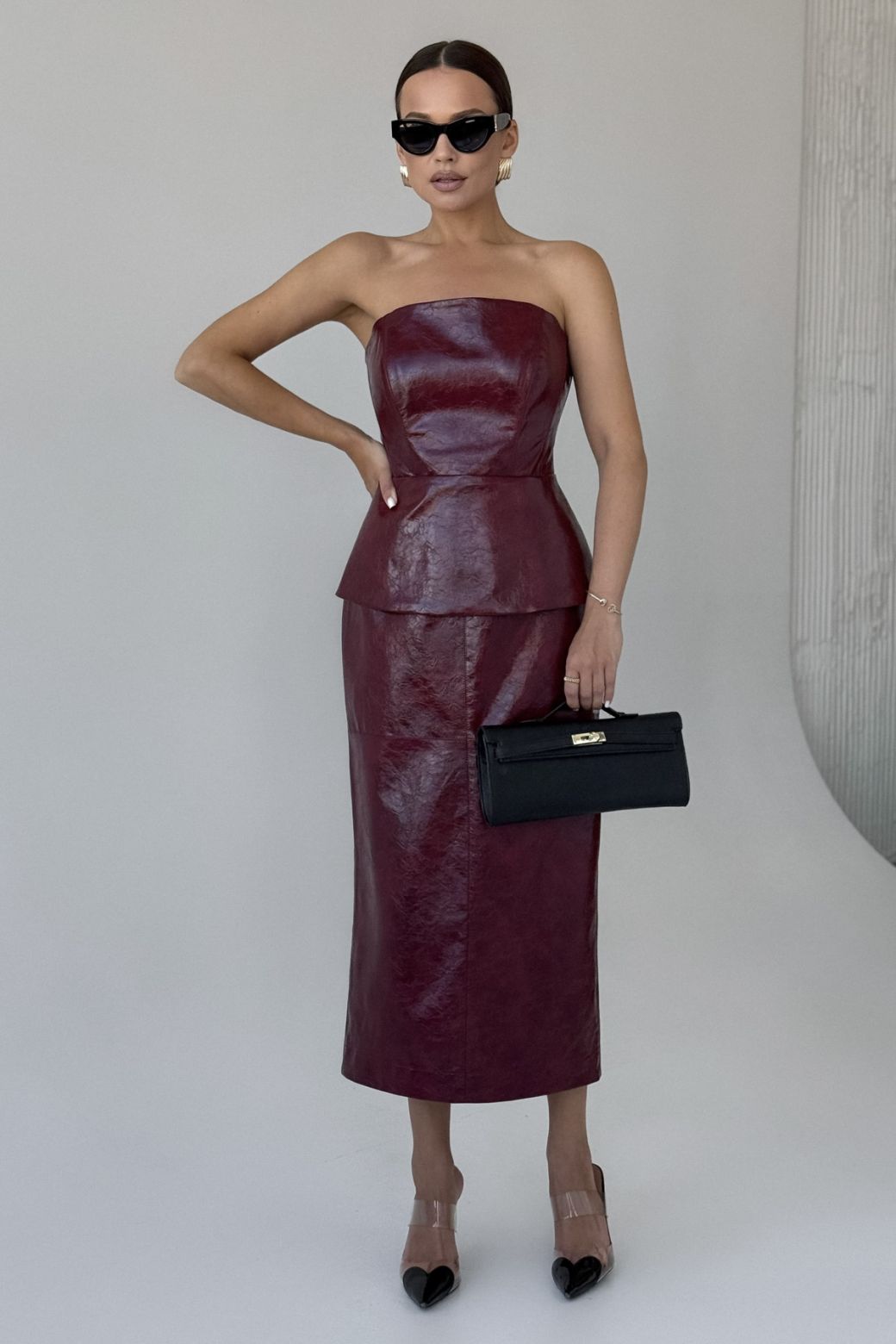 Юбка женская выполнена из искссутвенной кожи высокого качества на подкладке. Юбка прямого силуэта, верх юбки обработан покройным поясом. По переду юбки подрез с отделочными строчками. Застежка в виде потайной молнии по средней линии сзади.