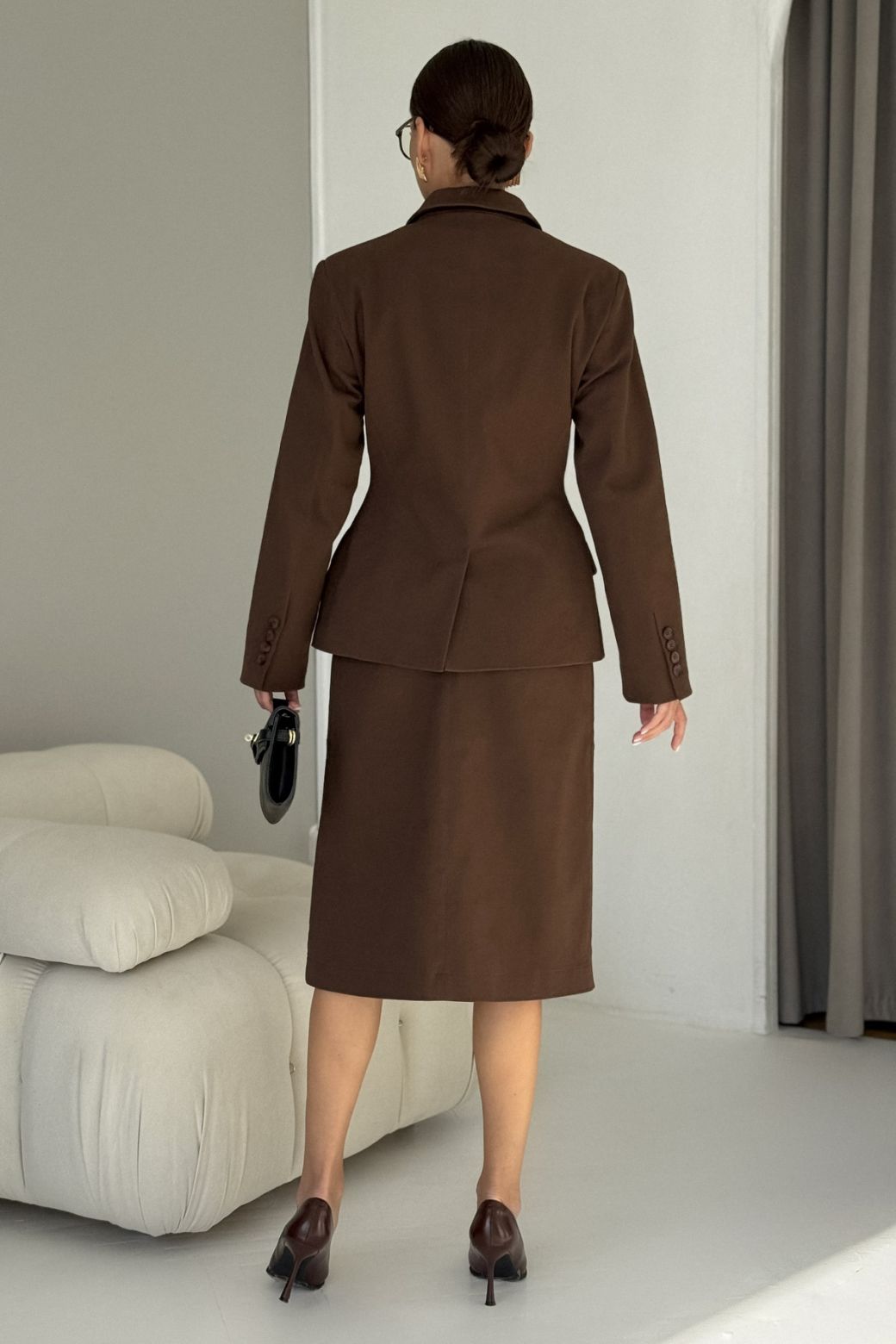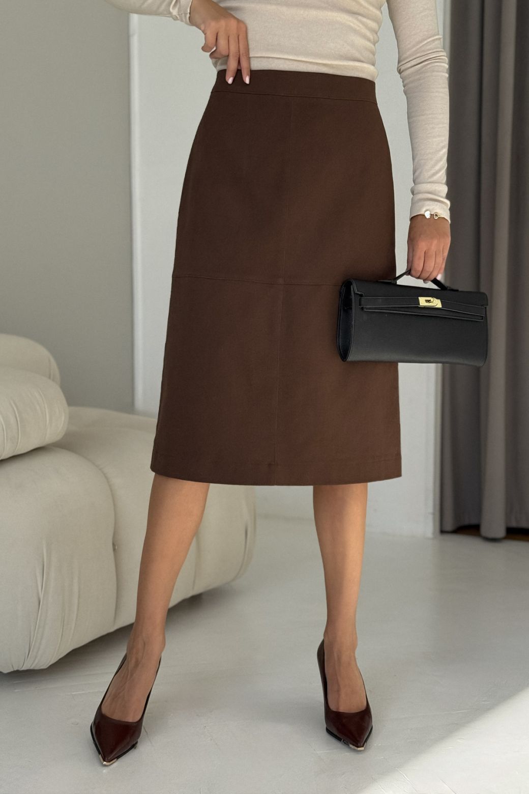 Юбка женская выполнена из костюмного джинса с бархатистым ворсом. Юбка слегка расширена к низу, верх юбки обработан покройным поясом. По переду юбки подрез с отделочными строчками. Застежка в виде потайной молнии по средней линии сзади.