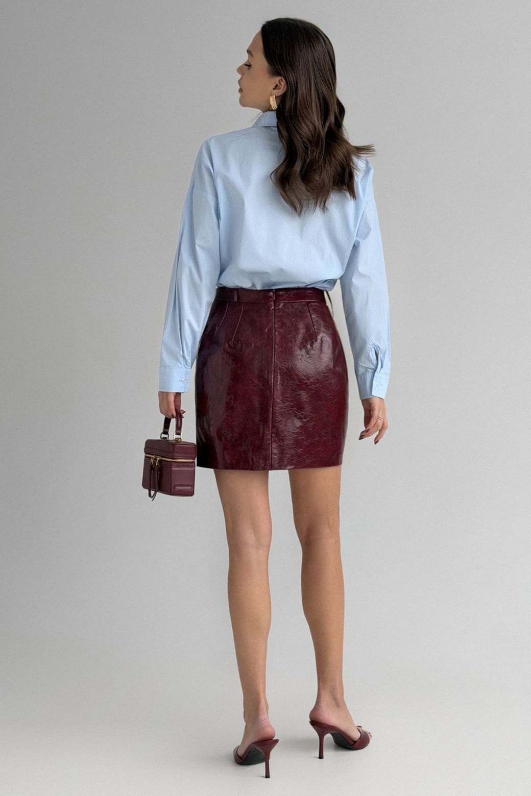 Юбка женская выполнена из искусственной кожи. Юбка на подкладке. Верх юбки обработан подкройным поясом. Застежка по спинке на потайную молнию.