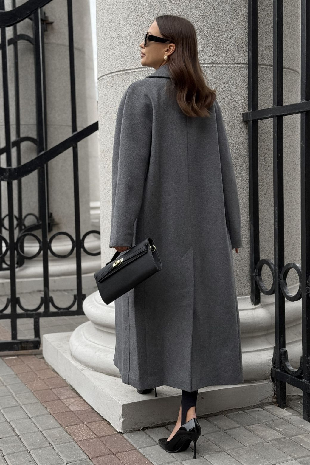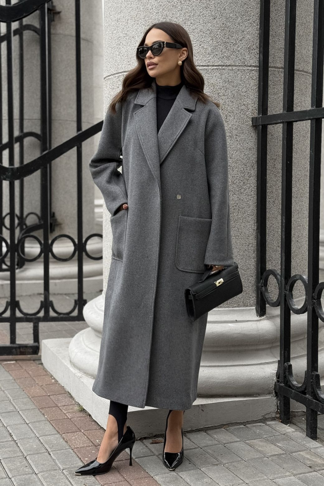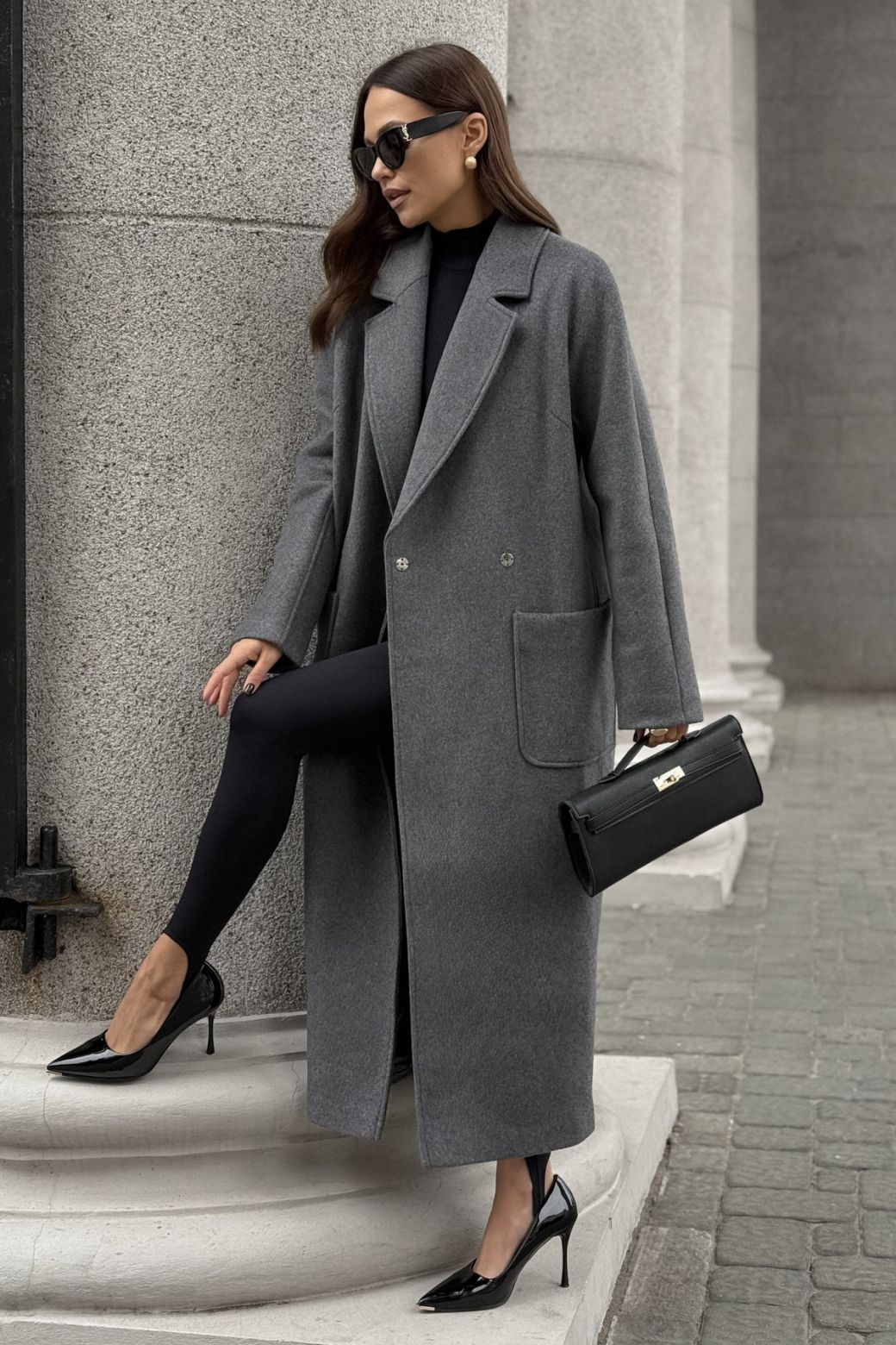Пальто женское двубортное , выполнено из пальтовой ткани великолепного качества . Рукав спущенный , воротник стояче-отложной с отворотами лацканов . По переду накладные карманы.