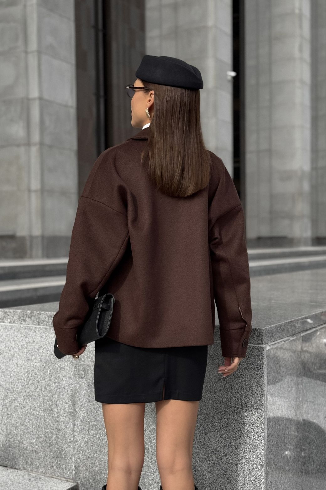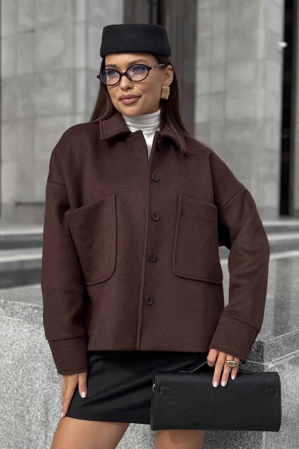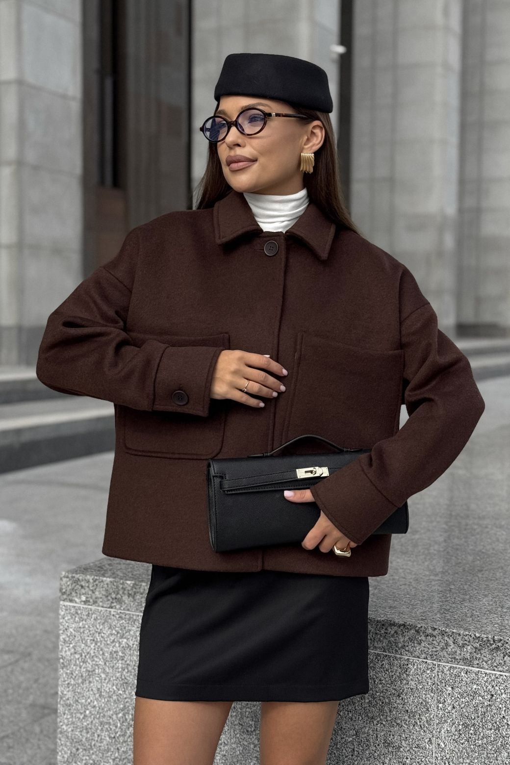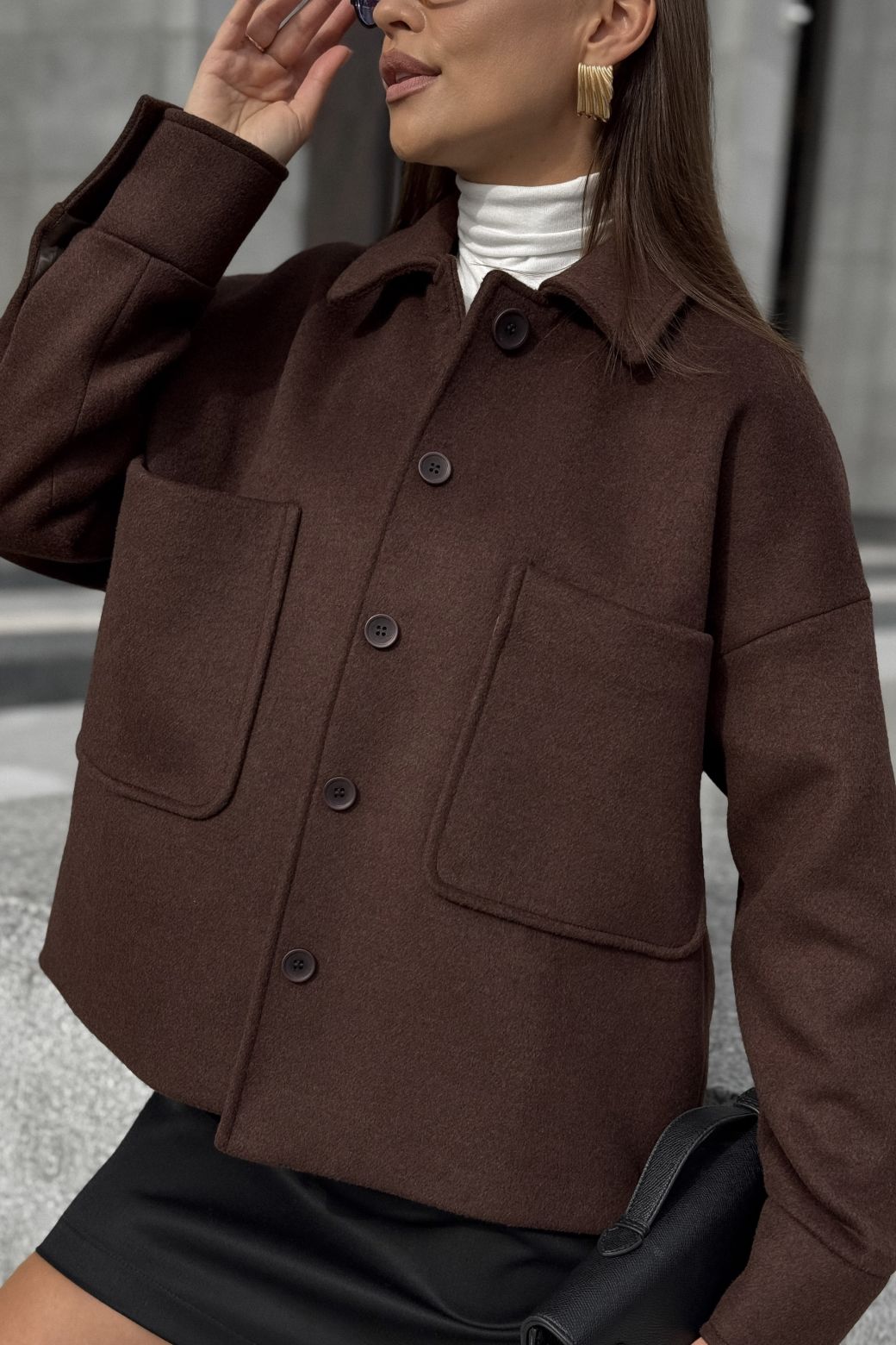 Пальто женское, укороченное выполнено из пальтовой ткани хорошего качества. Застежка центральная, потайная на петли и пуговицы. Рукав спущенный, низ рукава обработан притачной манжетой. Воротник стояче-отложной. По переду накладные карманы.